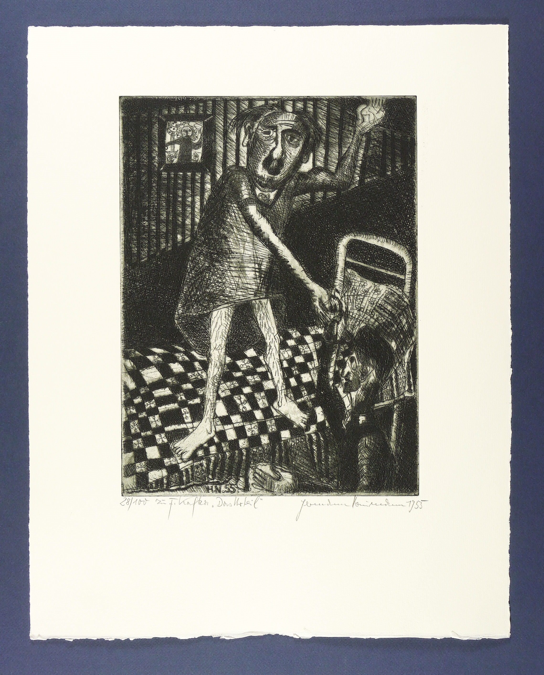 Aus: Hermann Naumann, Grafik zu Franz Kafka. Grafik-Edition XXI (Leipzig: Reclam 1985). – Rechts unten in Bleistift signiert und datiert. Links Auflagenbezeichnung und Titel. In der Platte am unteren Rand Monogramm und Jahr. – Sehr guter Zustand.
