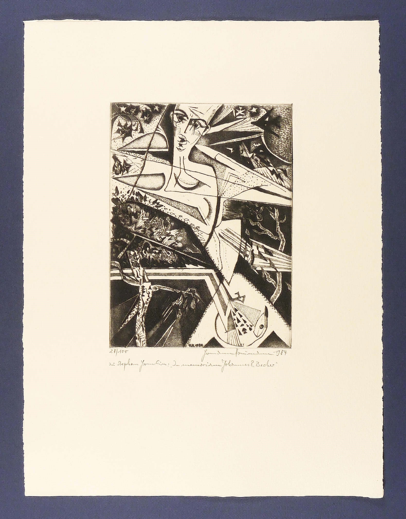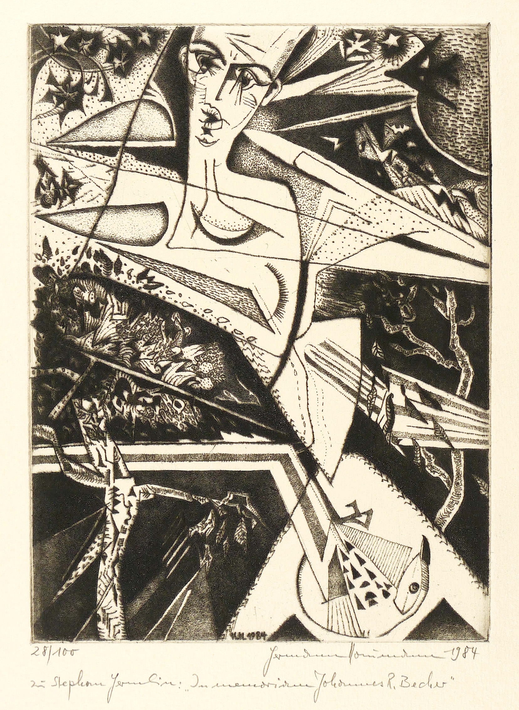 1984. Kupferstich / Punzenstich, in Schwarz, auf gelblichem Büttenpapier. – Originale Künstlergrafik, von Hermann Naumann. – Auflage Exemplar Nr. 28/100. – 24,4 x 18,2 cm (Darstellung / Platte), 48 x 36 cm (Blatt).