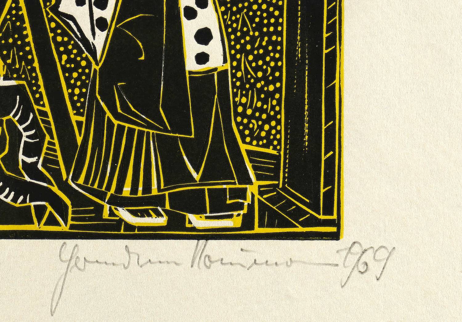 1969. Farbholzschnitt, in Gelb & Schwarz, auf wolkigem Büttenkarton. – Originale Künstlergrafik, von Hermann Naumann. – 22,8 x 12,8 cm (Darstellung / Druckstock), 45 x 31 cm (Blatt).