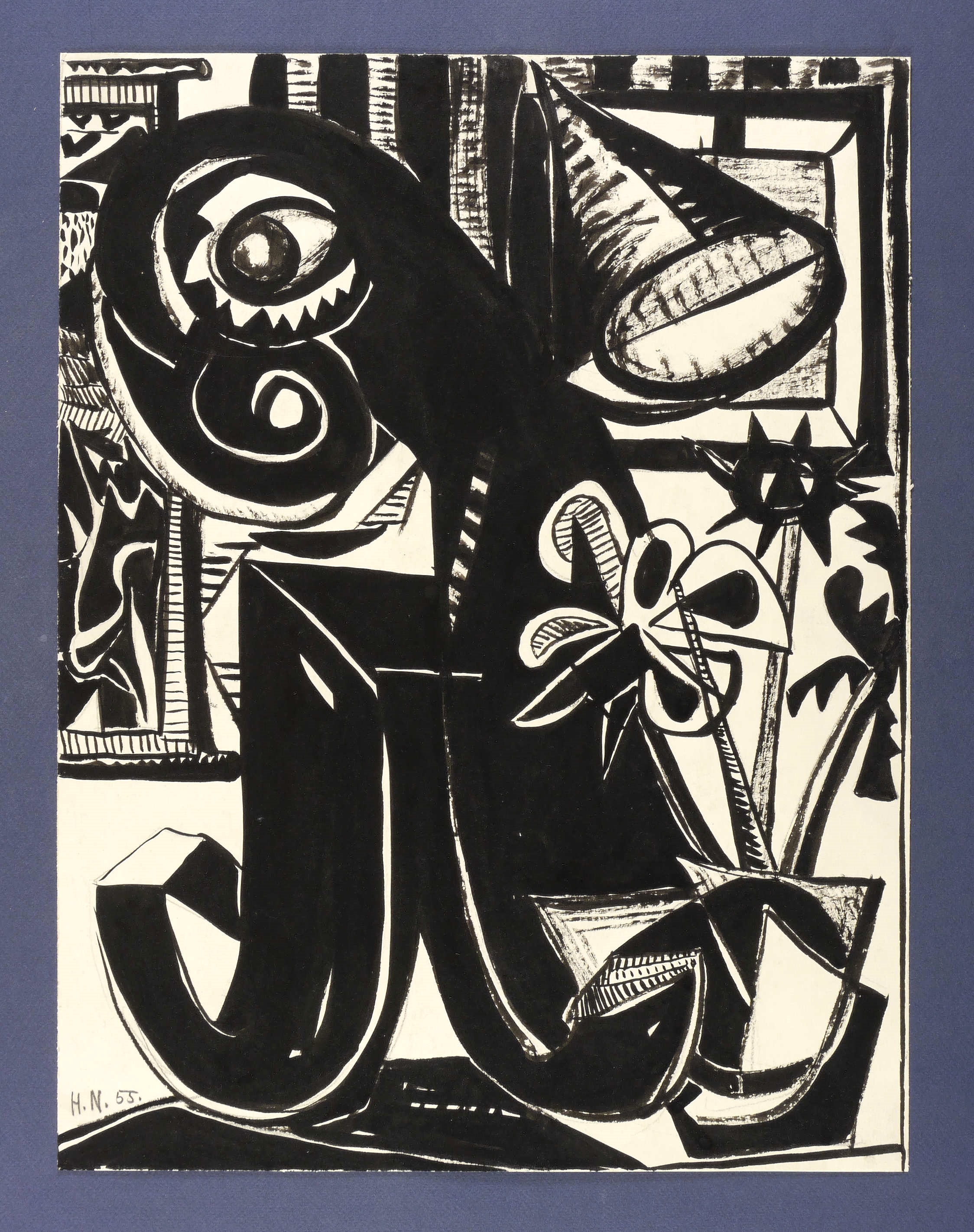 1955. Zeichnung / Pinselzeichnung, in schwarzer Tusche, auf hellem Karton. – Originale Künstlergrafik, von Hermann Naumann. – Unikat. – 49,8 x 38,1 cm (Darstellung / Blatt).