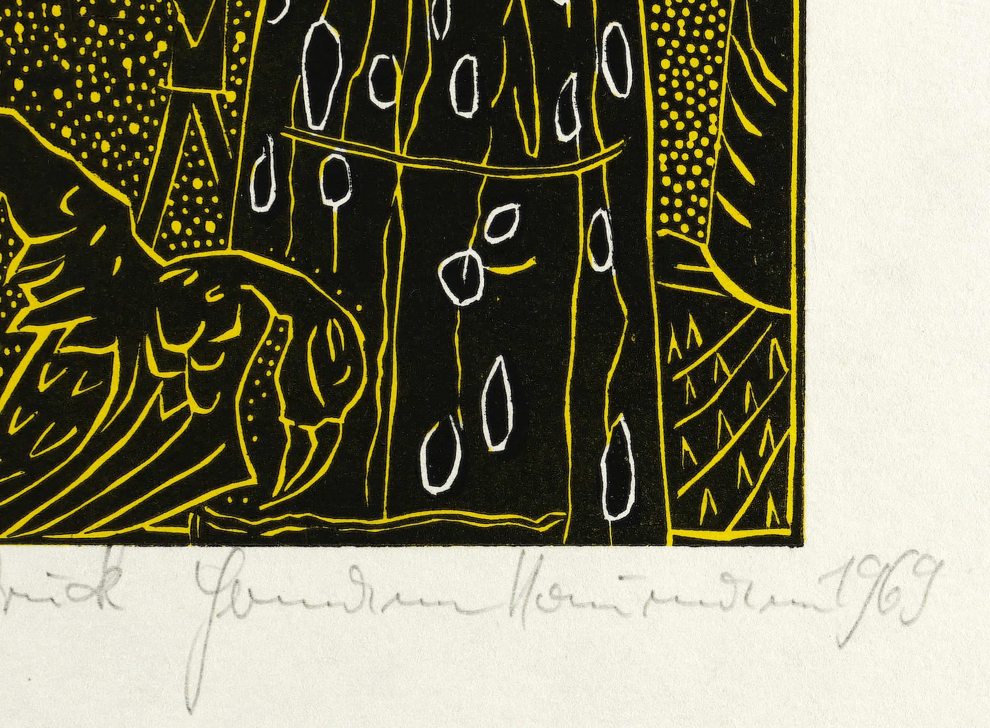 1969. Farbholzschnitt, in Gelb & Schwarz, auf wolkigem Büttenkarton. – Originale Künstlergrafik, von Hermann Naumann. – 22,9 x 12,8 cm (Darstellung / Druckstock), 45 x 31 cm (Blatt).