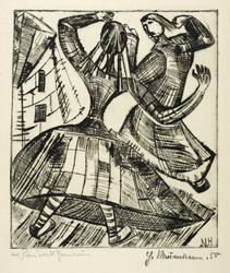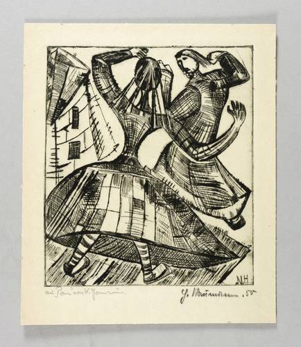 1950. Radierung / Kaltnadel, in Schwarz, auf wolkigem gelblichem Karton. – Originale Künstlergrafik, von Hermann Naumann. – 16,7 x 14,4 cm (Darstellung / Platte), 20,8 x 17,5 cm (Blatt).