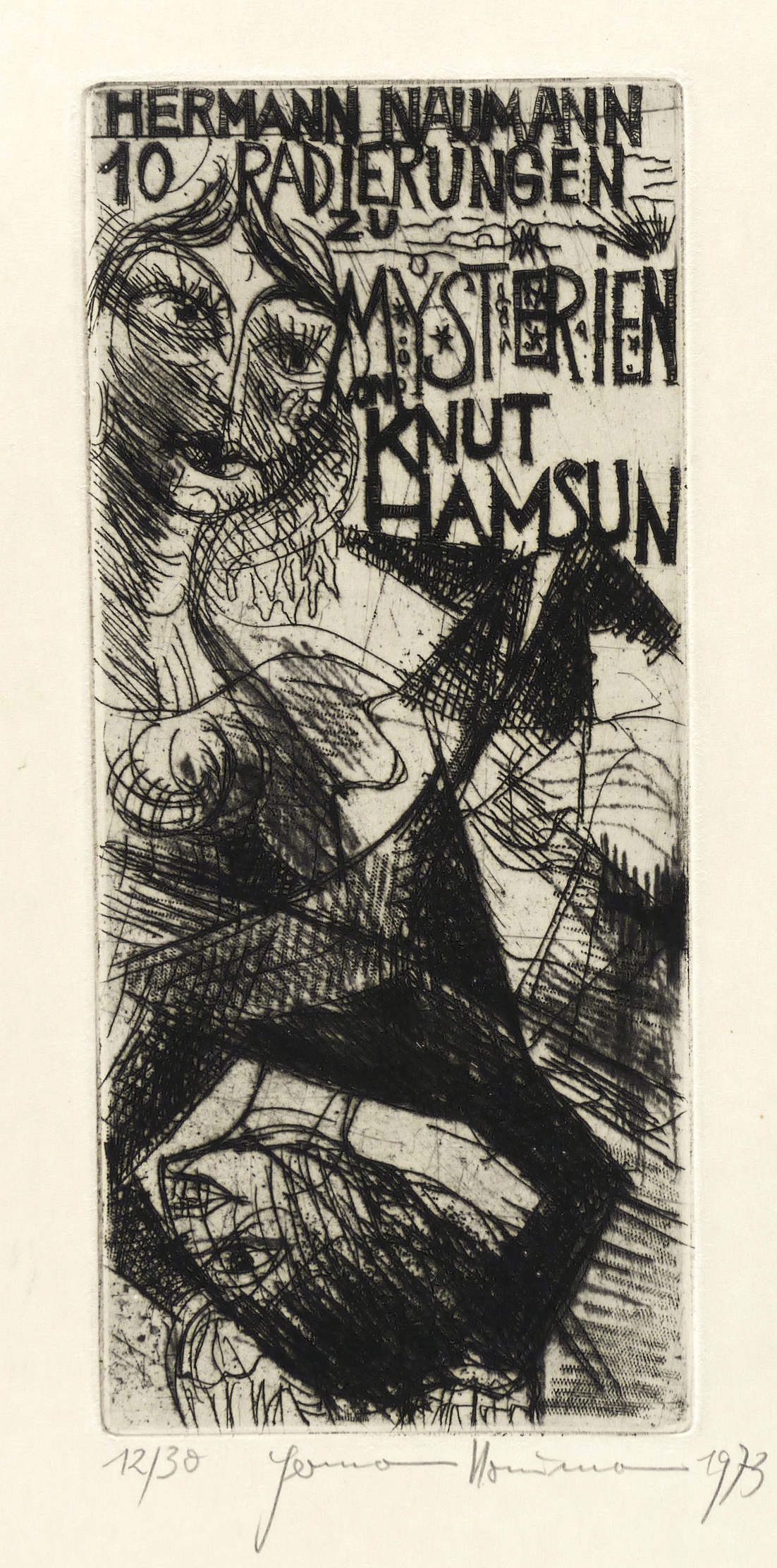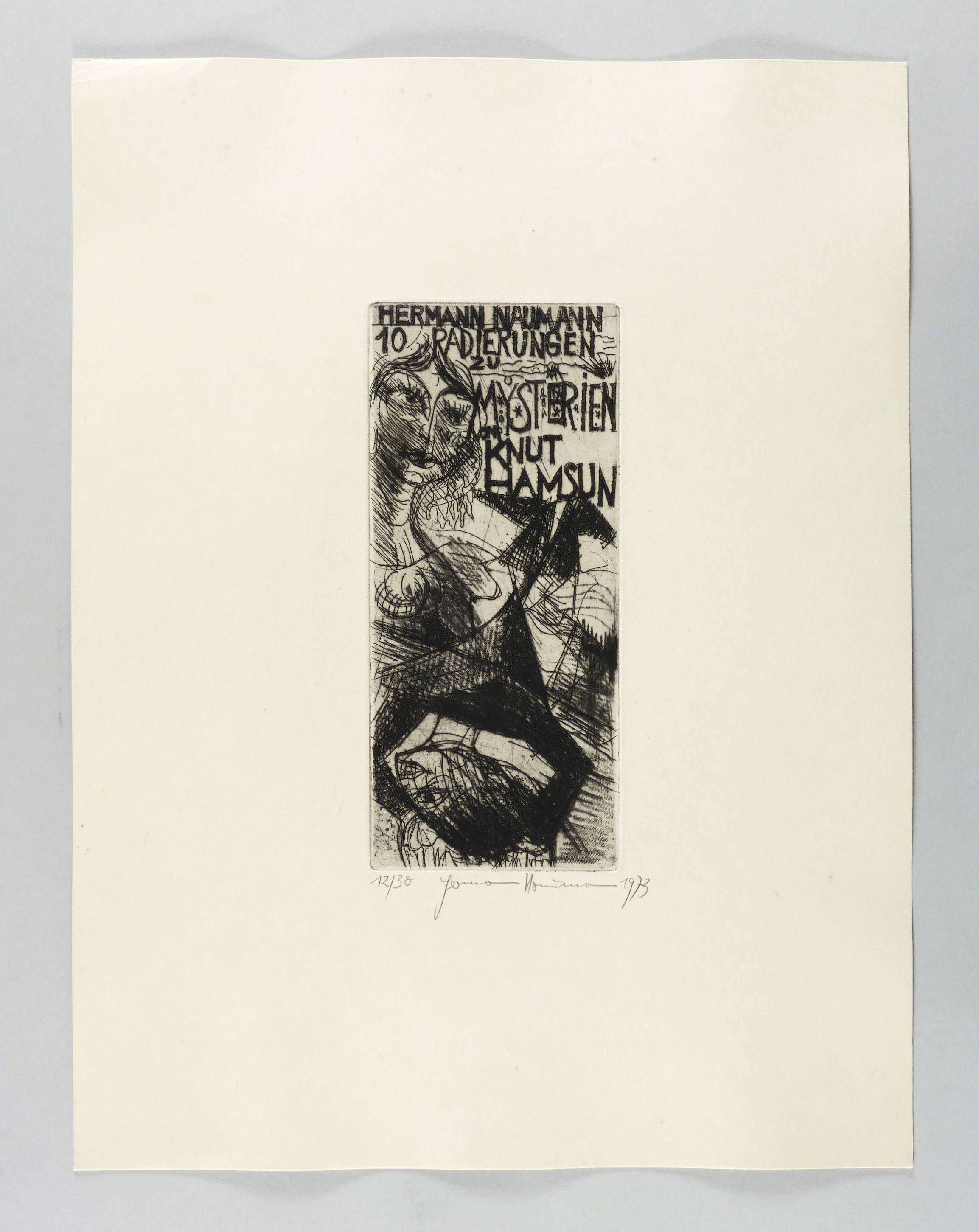 Rechts unten in Bleistift signiert und datiert. Links Auflagenbezeichnung. In der Platte Inschrift: ″HERMANN NAUMANN / 10 RADIERUNGEN ZU MYSTERIEN VON KNUT HAMSUN″. – Titelblatt zur Folge von 10 Radierungen zu den ″Mysterien″ von Knut Hamsun (1973). – Papier leicht gegilbt und angeschmutzt. Blatt etwas bestoßen, marginal stockfleckig und knickspurig. Insgesamt gut erhalten.