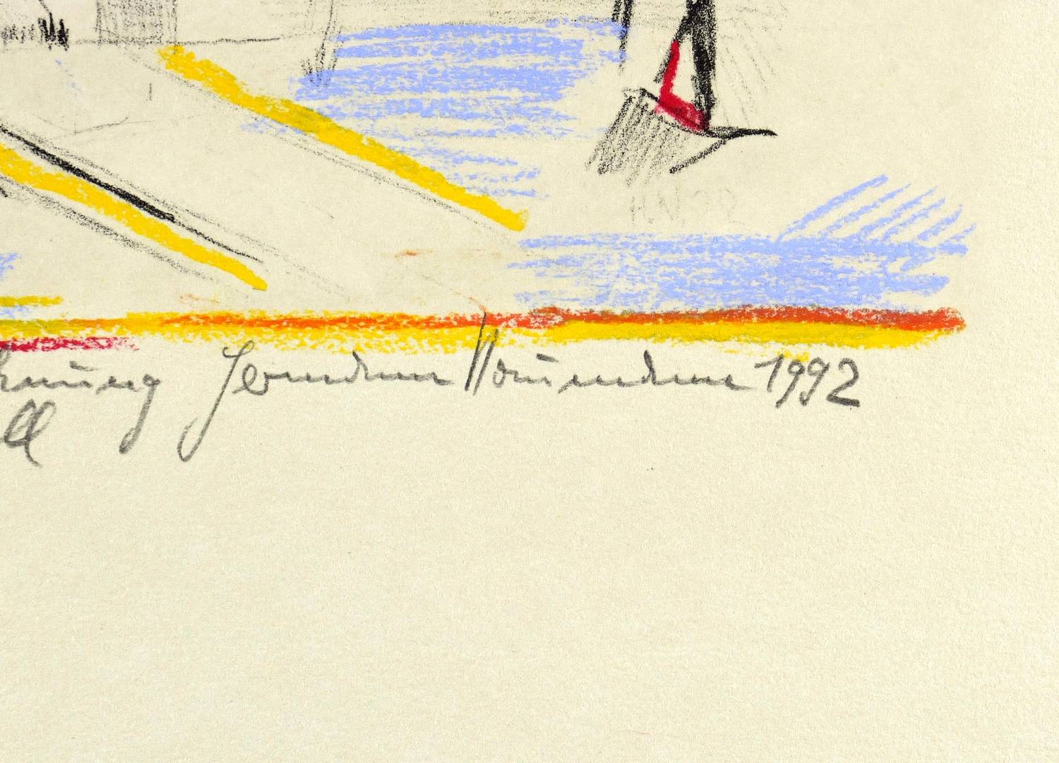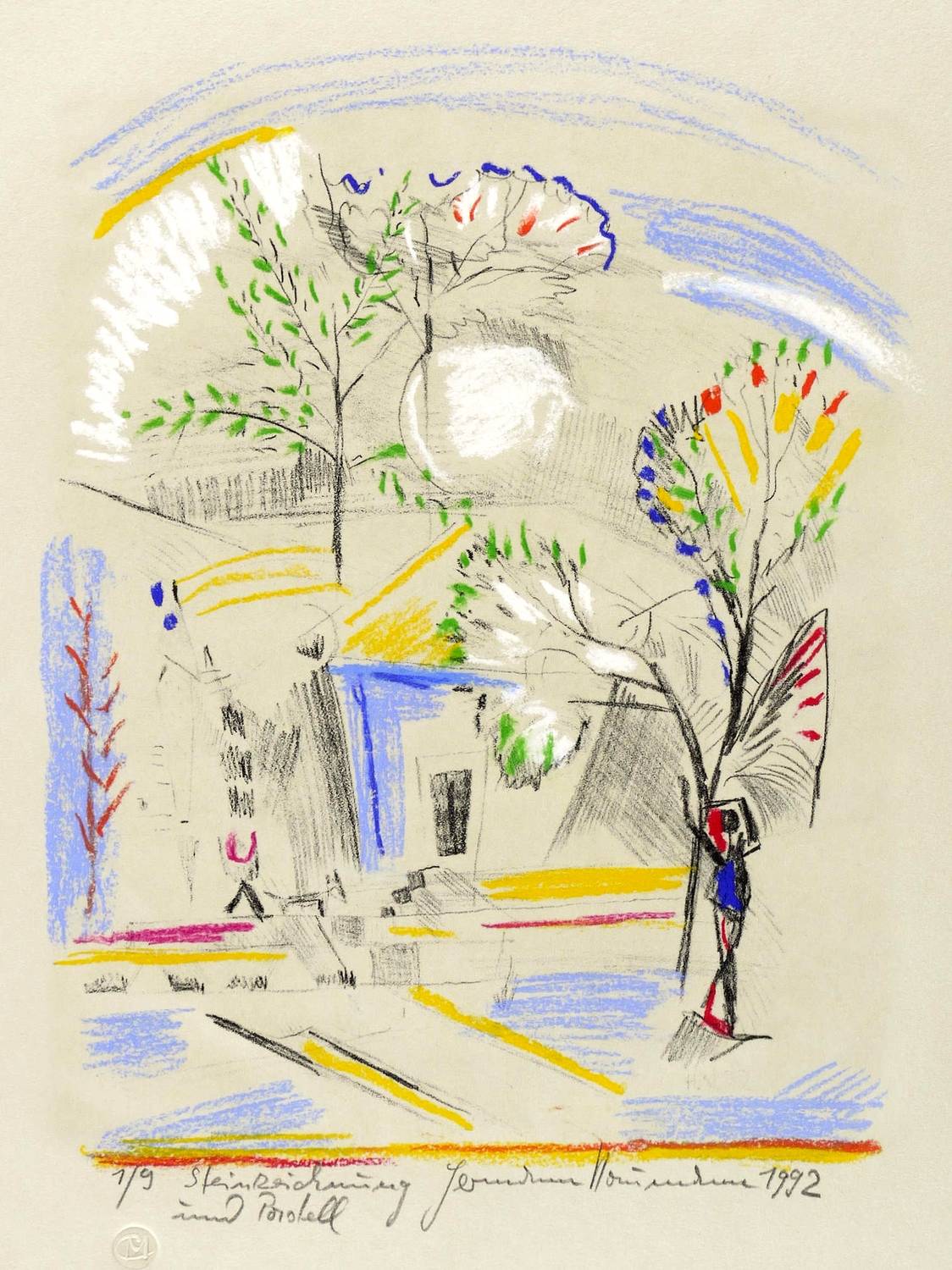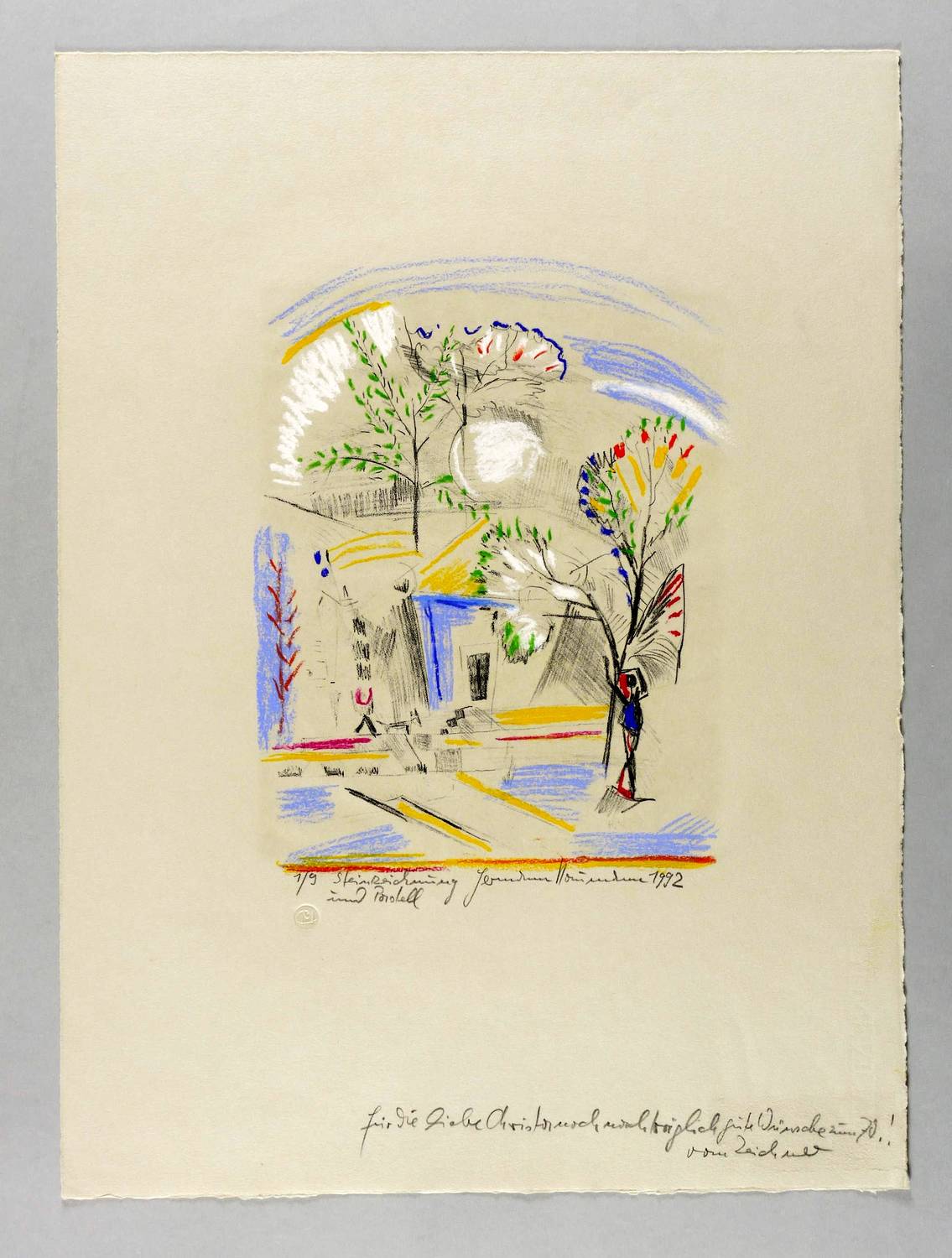 1992. Lithografie / Kreidelithografie, mit Pastellkreide überarbeitet, auf grauem Hahnemühle. – Originale Künstlergrafik, von Hermann Naumann. – Auflage Exemplar Nr. 1/9 - Unikat. – 29,0 x 22,5 cm (Darstellung / Druckbild), 54 x 40 cm (Blatt).