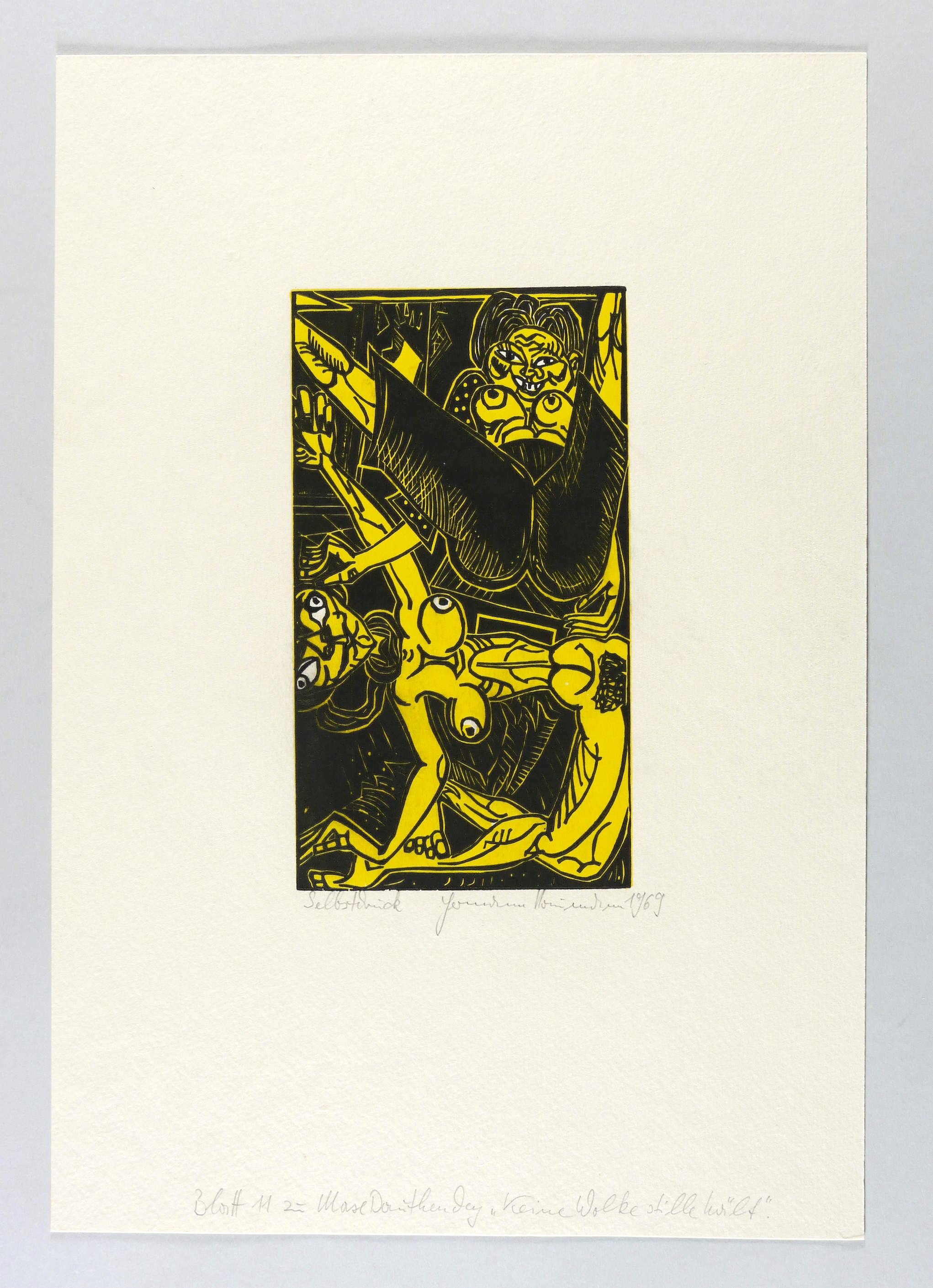 1969. Farbholzschnitt, in Gelb & Schwarz, auf wolkigem Büttenkarton. – Originale Künstlergrafik, von Hermann Naumann. – 22,8 x 12,8 cm (Darstellung / Druckstock), 45 x 31 cm (Blatt).