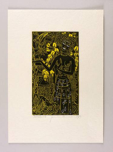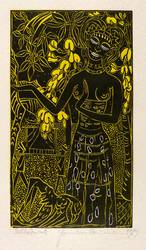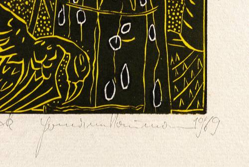 1969. Farbholzschnitt, in Gelb & Schwarz, auf wolkigem Büttenkarton. – Originale Künstlergrafik, von Hermann Naumann. – 22,9 x 12,8 cm (Darstellung / Druckstock), 37 x 27 cm (Blatt).