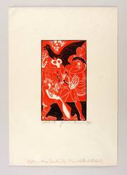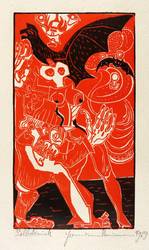 1969. Farbholzschnitt, in Rot & Schwarz, auf wolkigem Büttenkarton. – Originale Künstlergrafik, von Hermann Naumann. – 22,8 x 12,8 cm (Darstellung / Druckstock), 45 x 31 cm (Blatt).