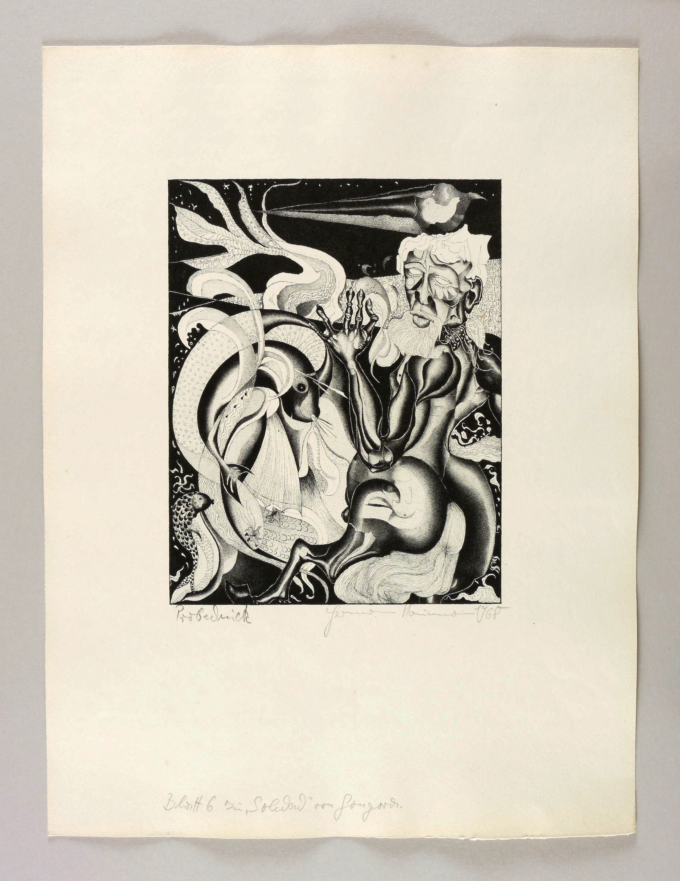 Aus: Hermann Naumann, Soledades. Von Luis de Góngora y Argote (Hamburg & Düsseldorf: Claassen Verlag 1969). – Rechts unten in Bleistift signiert und datiert: ″Hermann Naumann 1968″. Links Auflagenbezeichnung: ″Probedruck″. Am unteren Blattrand Folgennummer und -titel. – Geringfügige Lagerspuren. In den Blattkanten leicht gewellt. Insgesamt guter Zustand.