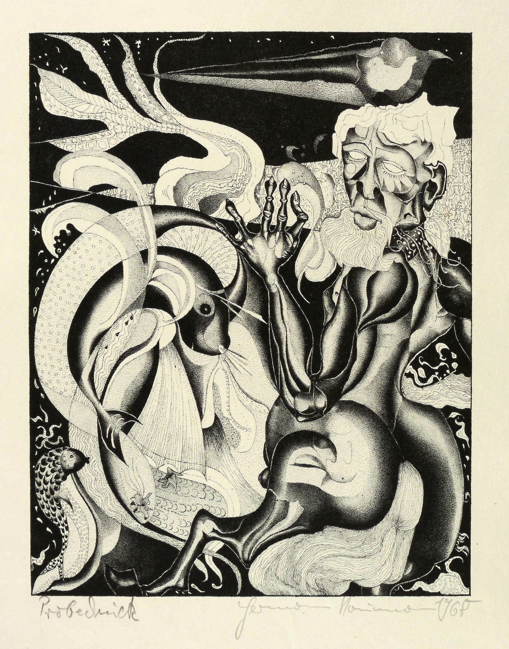1968. Lithografie / Federlithografie, in Punktiermanier, in Schwarz, auf hartem hellchamois Velin. – Originale Künstlergrafik, von Hermann Naumann. – Probedruck. – 26,9 x 21,0 cm (Darstellung / Druckbild), 50 x 38 cm (Blatt).