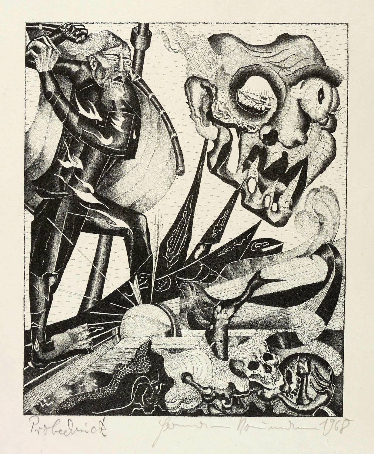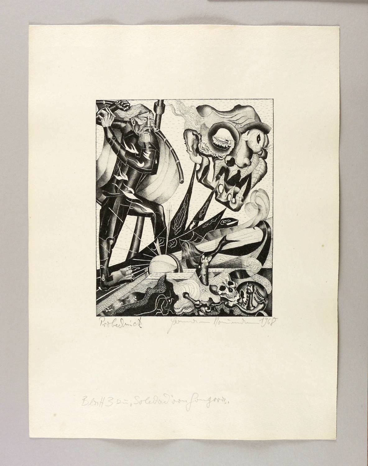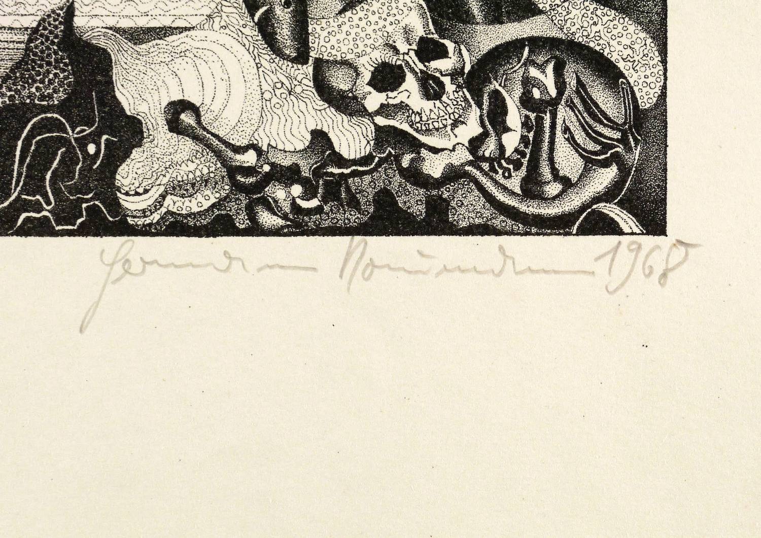 1968. Lithografie / Federlithografie, in Punktiermanier, in Schwarz, auf hartem hellchamois Velin. – Originale Künstlergrafik, von Hermann Naumann. – Probedruck. – 26,3 x 21,4 cm (Darstellung / Druckbild), 50 x 38 cm (Blatt).