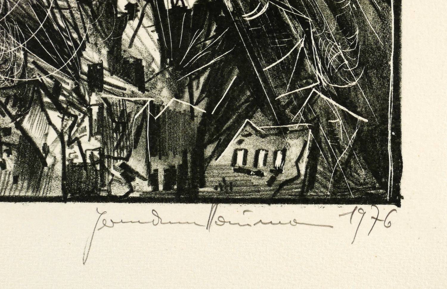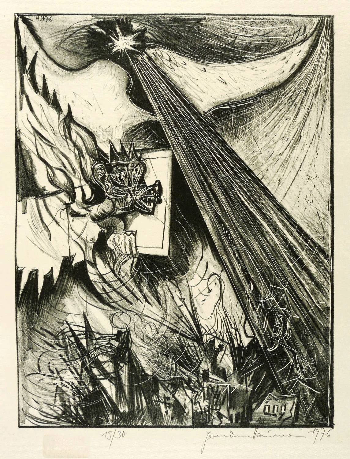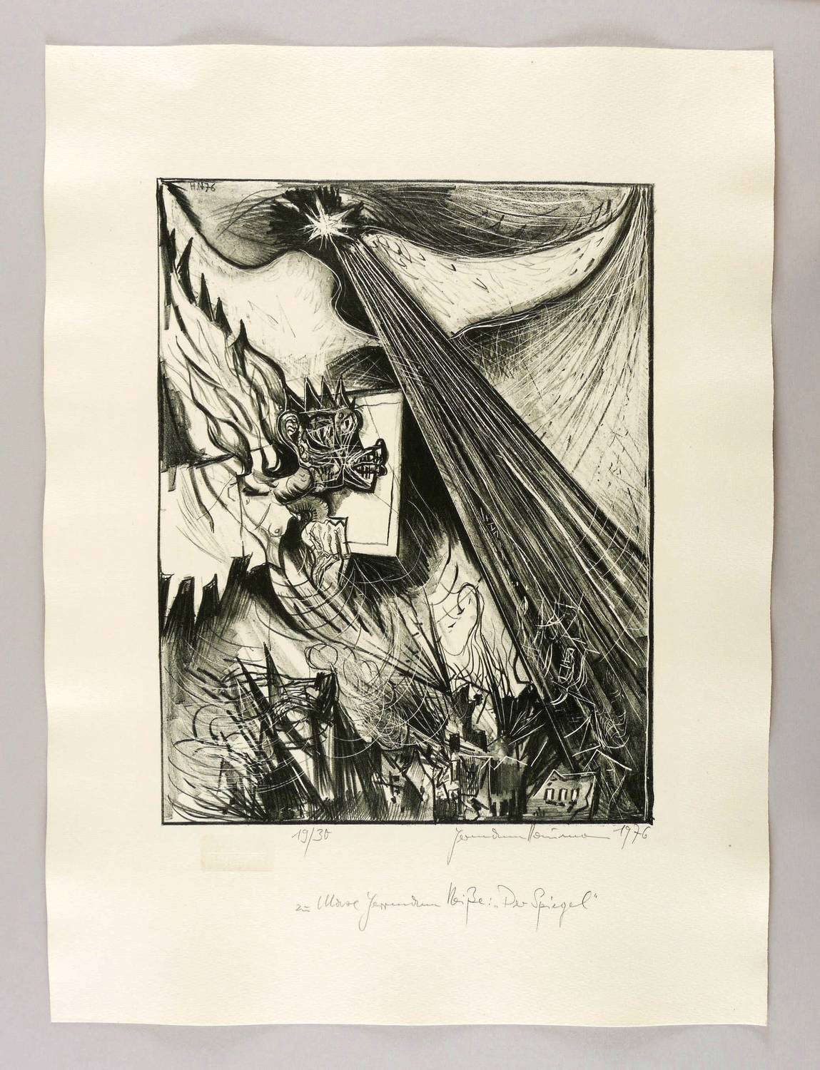 1976. Lithografie / Kreidelithografie, in Schwarz, auf hartem gelblichem Maschinenpapier. – Originale Künstlergrafik, von Hermann Naumann. – Auflage Exemplar Nr. 19/30. – 42,1 x 32,3 cm (Darstellung / Druckbild), 64 x 48 cm (Blatt).