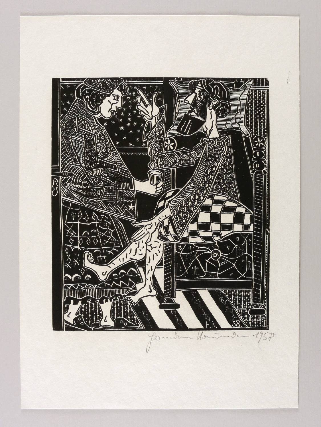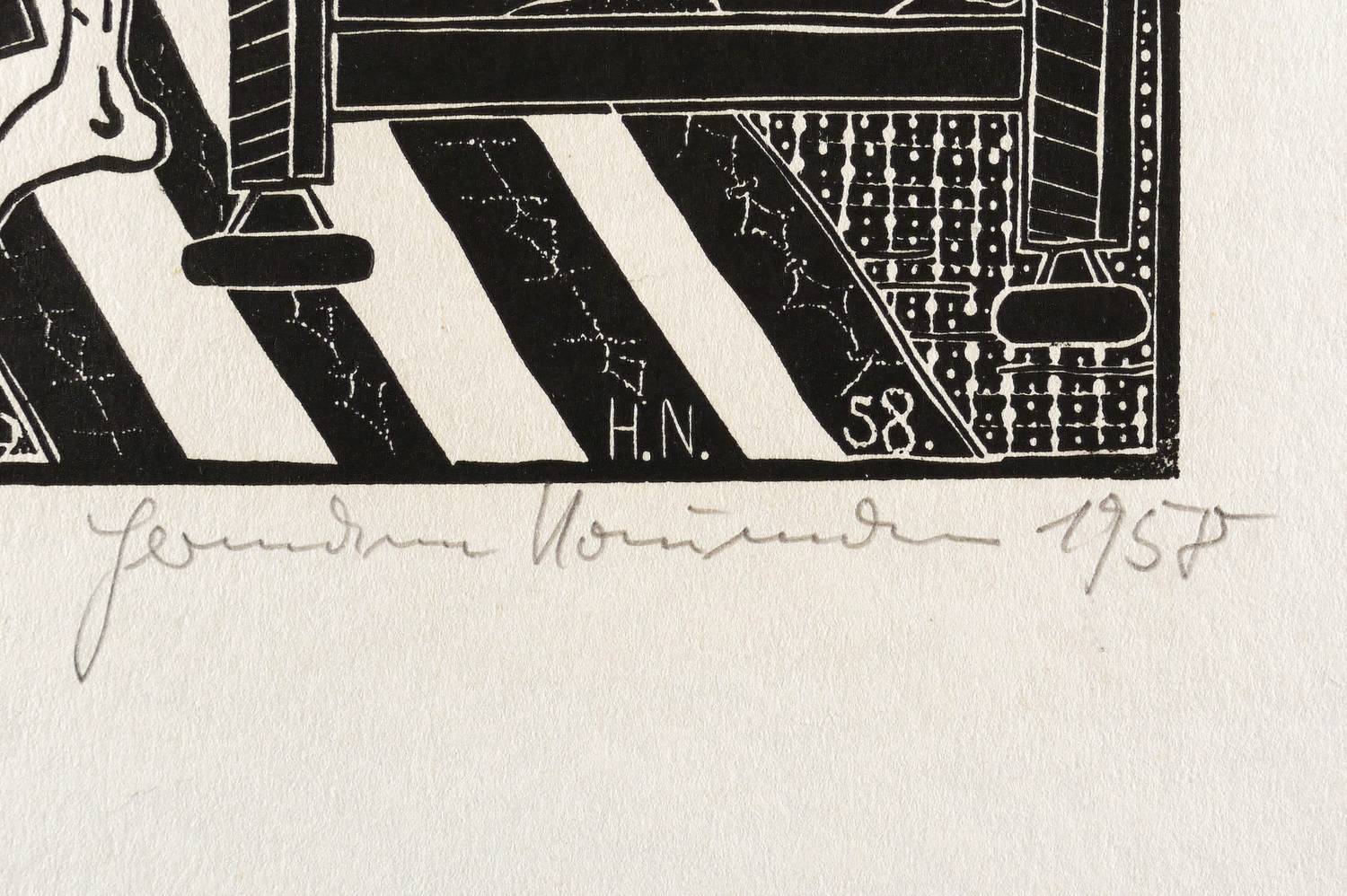 Rechts unten in Bleistift signiert und datiert: ″Hermann Naumann 1958″. Im Druckstock rechts unten Monogramm und Jahr: ″H.N. 58.″ – Aus der 12-teiligen Holzschnitt-Folge zu ″Tewje der Milchmann″ (Scholem Alejchem). – Sehr guter Zustand.