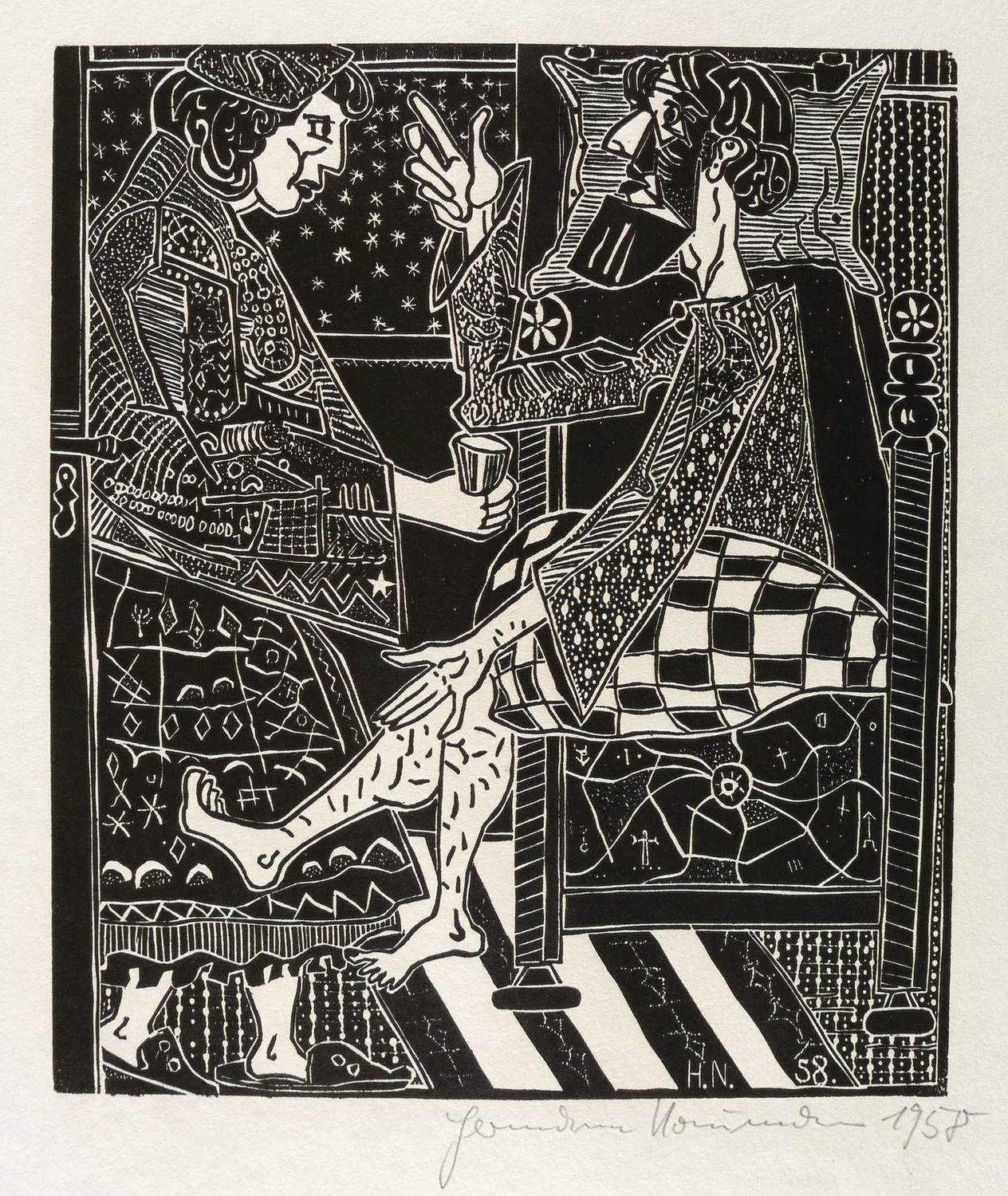 1958. Holzschnitt, in Schwarz, auf rauem wolkigem chamois Velin. – Originale Künstlergrafik, von Hermann Naumann. – 28,0 x 24,1 cm (Darstellung / Druckstock), 44 x 31 cm (Blatt).