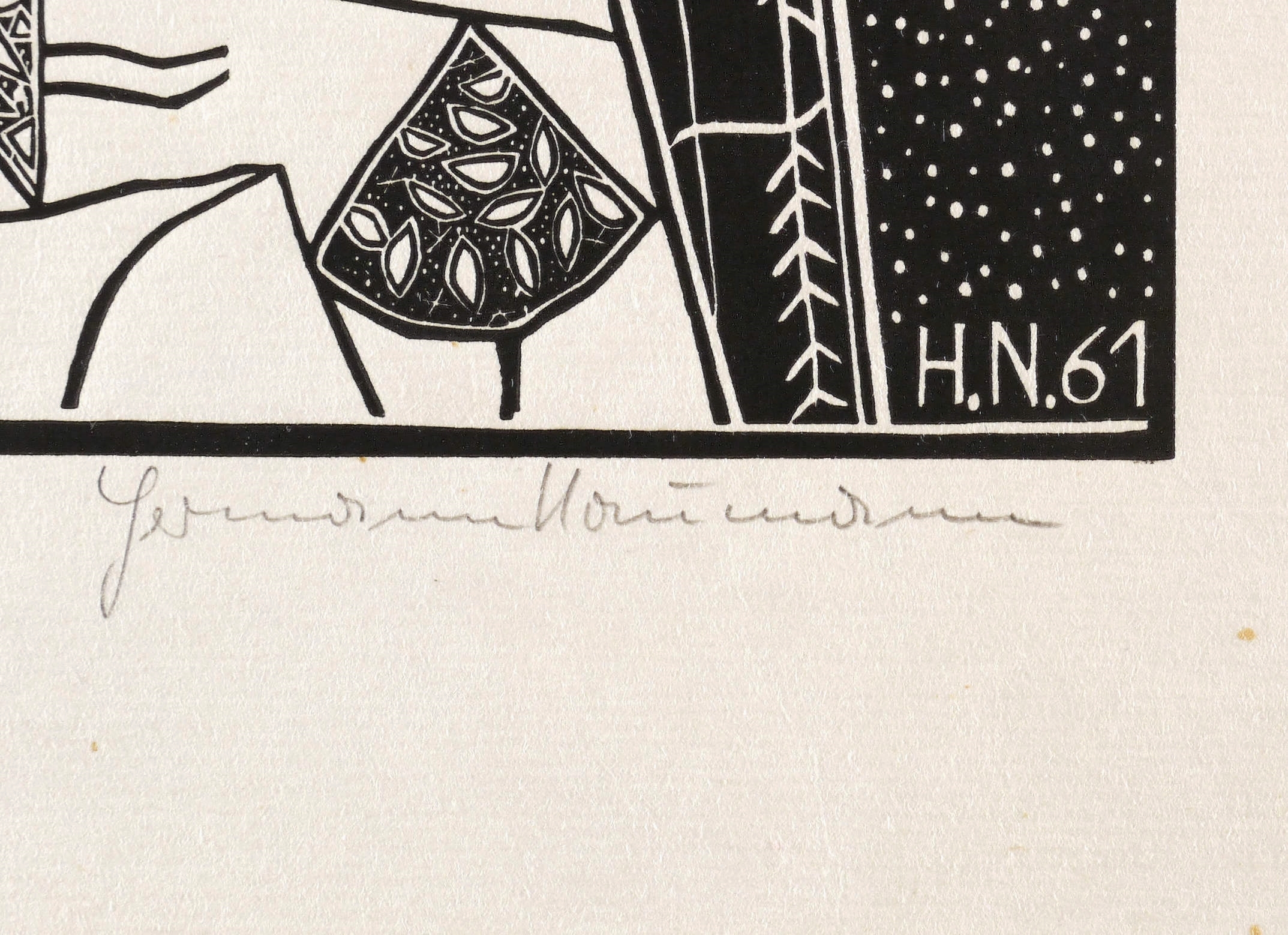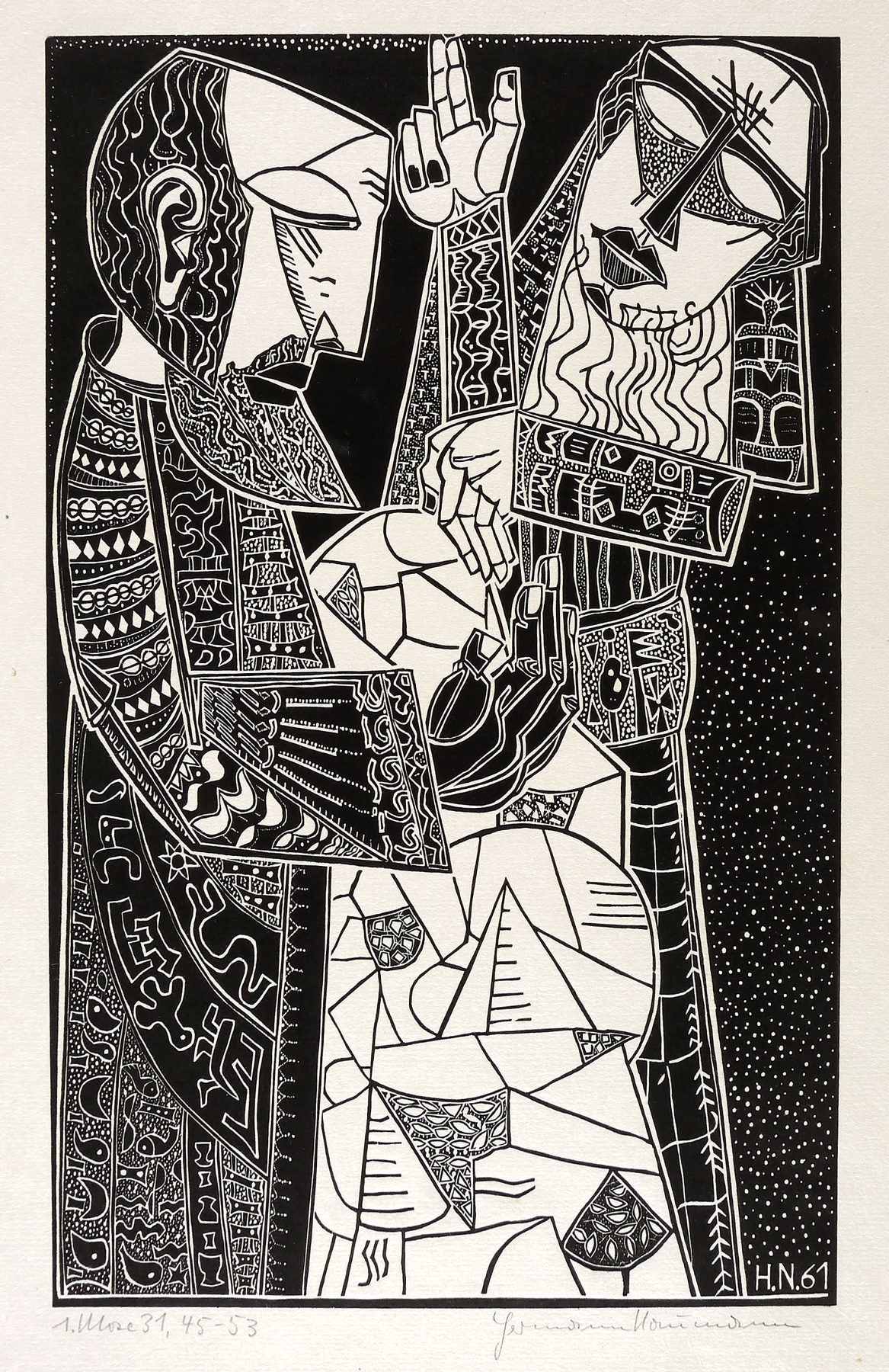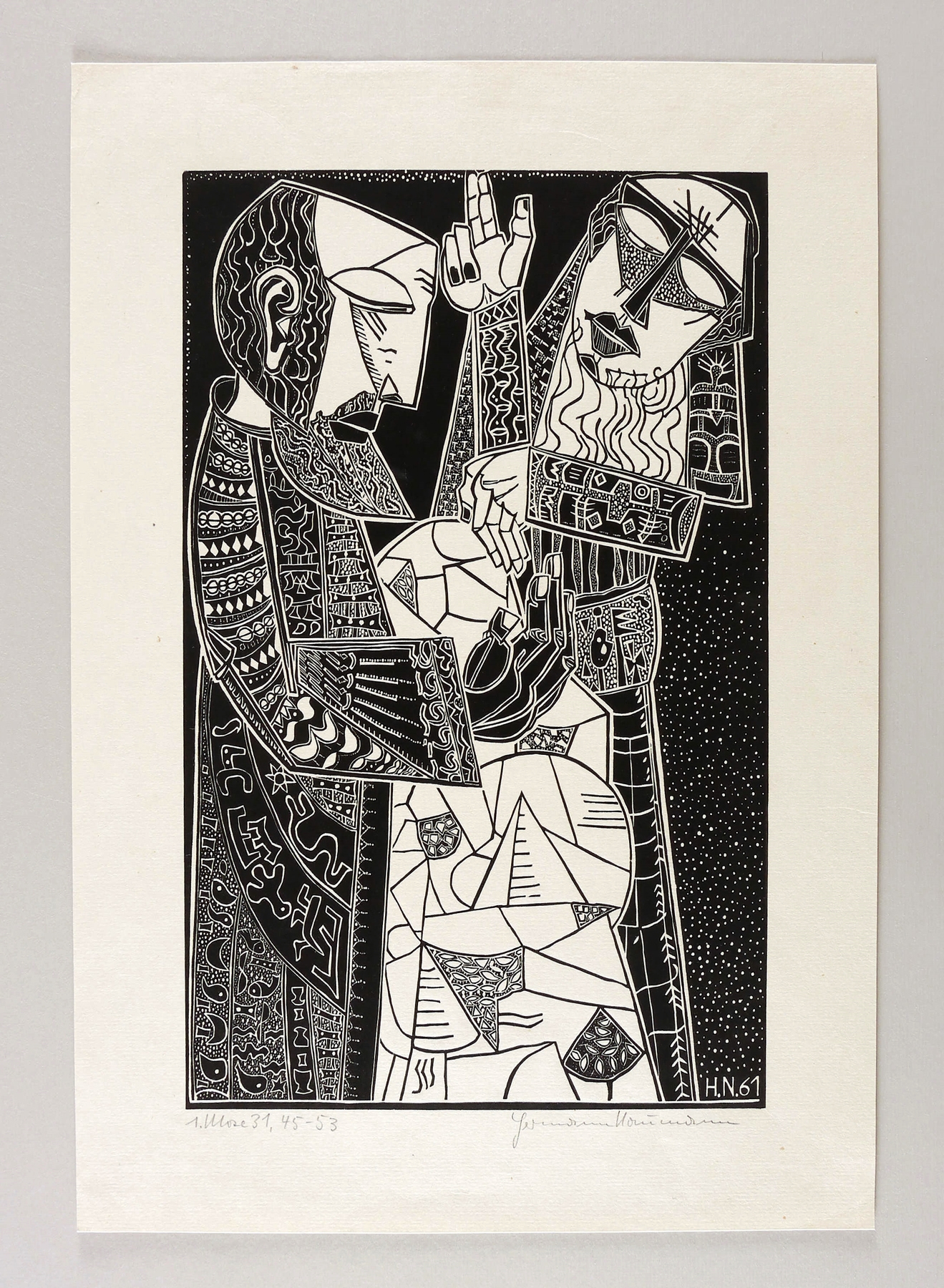 1961. Holzschnitt / Weißlinienschnitt, in Schwarz, auf grobem gelblichem Velin. – Originale Künstlergrafik, von Hermann Naumann. – 40,2 x 25,0 cm (Darstellung / Druckstock), 50 x 35 cm (Blatt).