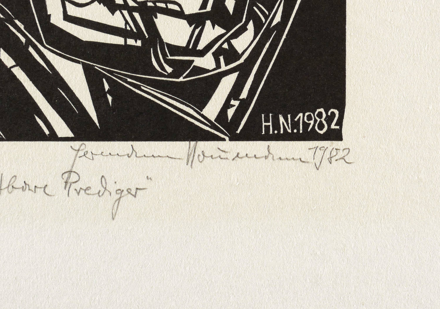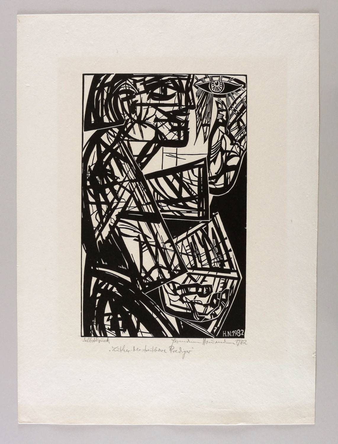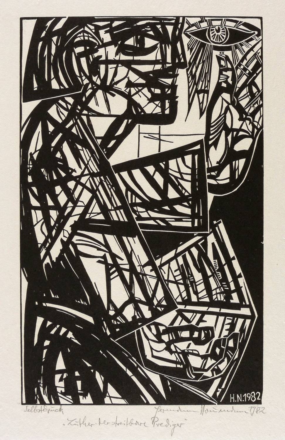 Rechts unten in Bleistift signiert und datiert: ″Hermann Naumann 1982″. Links bezeichnet: ″Selbstdruck″. Darunter Titel: ″Luther - der streitbare Prediger″. Im Holzstock rechts unten Signatur und Jahr: ″H.N. 1982″. – Handdruck des Künstlers. – Leichte Altersspuren. Schwach ausgeprägter Lichtrand um die Darstellung. Rechts minimale Randmängel. Mäßig guter Zustand.