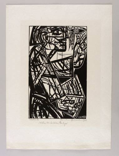 1982. Holzschnitt, in Schwarz, auf wolkig-rauem gelbem Velin. – Originale Künstlergrafik, von Hermann Naumann. – 40,0 x 25,0 cm (Darstellung / Druckstock), 63 x 46 cm (Blatt).