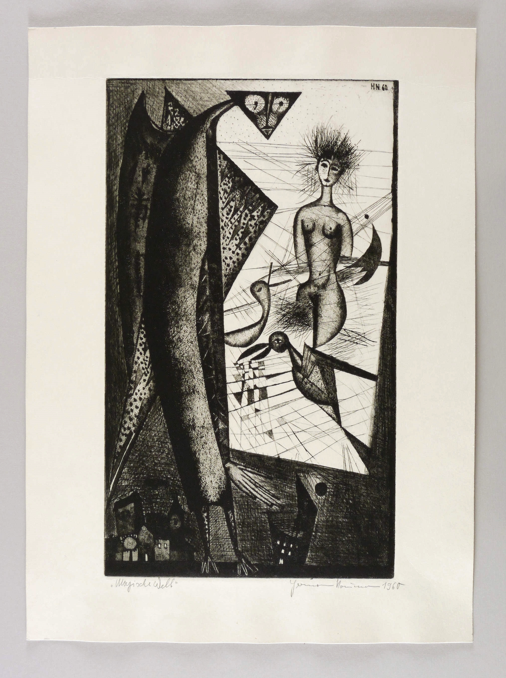 Rechts unten in Bleistift signiert und datiert: ″Hermann Naumann 1960″. Links Titel: ″Magische Welt″. In der Platte rechts oben Signatur und Jahr: ″H.N. 60″. – Breitrandiges Exemplar. Sehr guter Zustand.