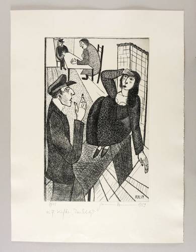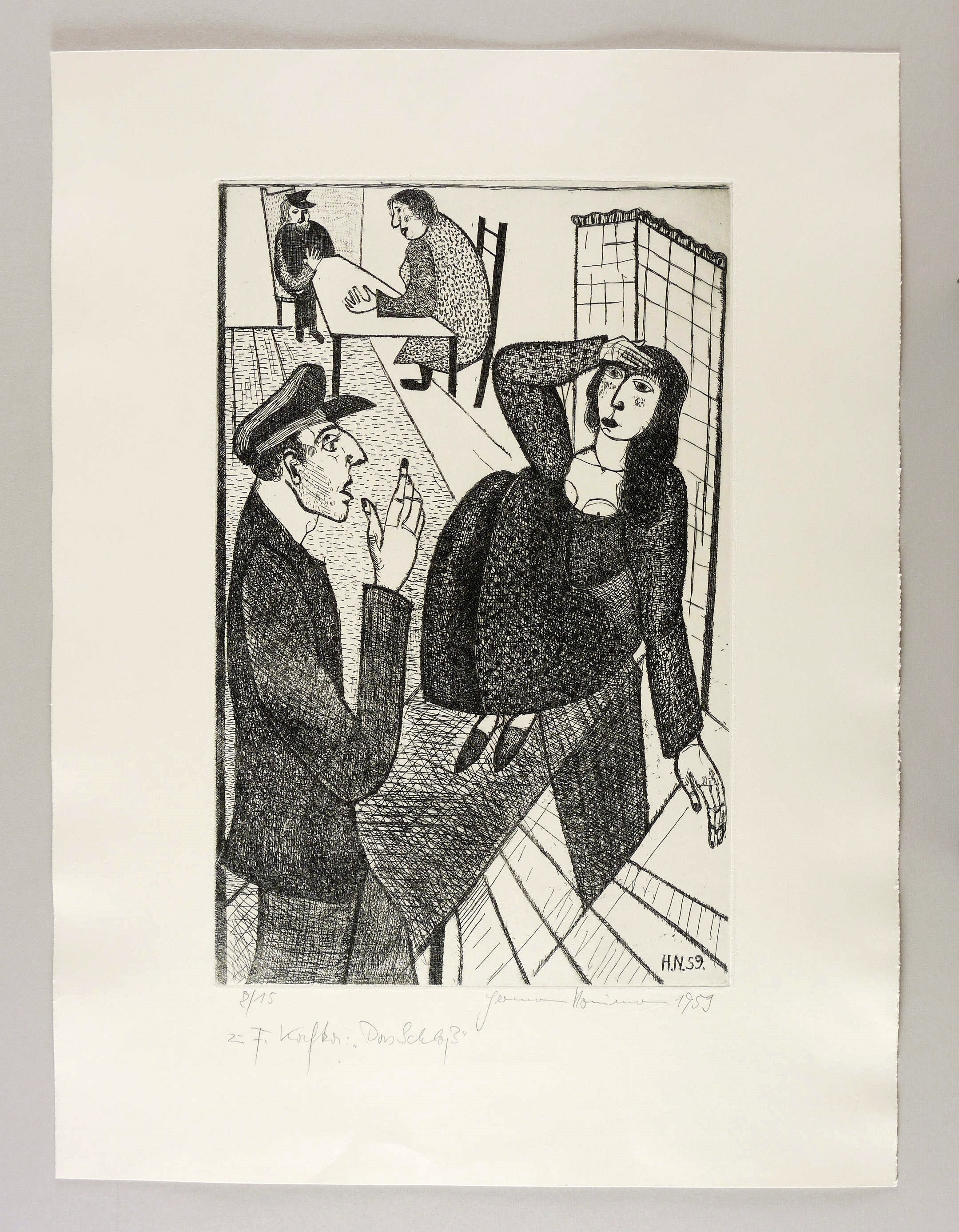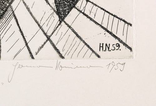 Rechts unten in Bleistift signiert und datiert: ″Hermann Naumann 1959″. Links Auflagenbezeichnung. Darunter Titel: ″zu F. Kafka: Das Schloß″. In der Platte rechts unten Signatur und Jahr: ″H.N. 59.″ – Schönes Exemplar. Sehr guter Zustand.