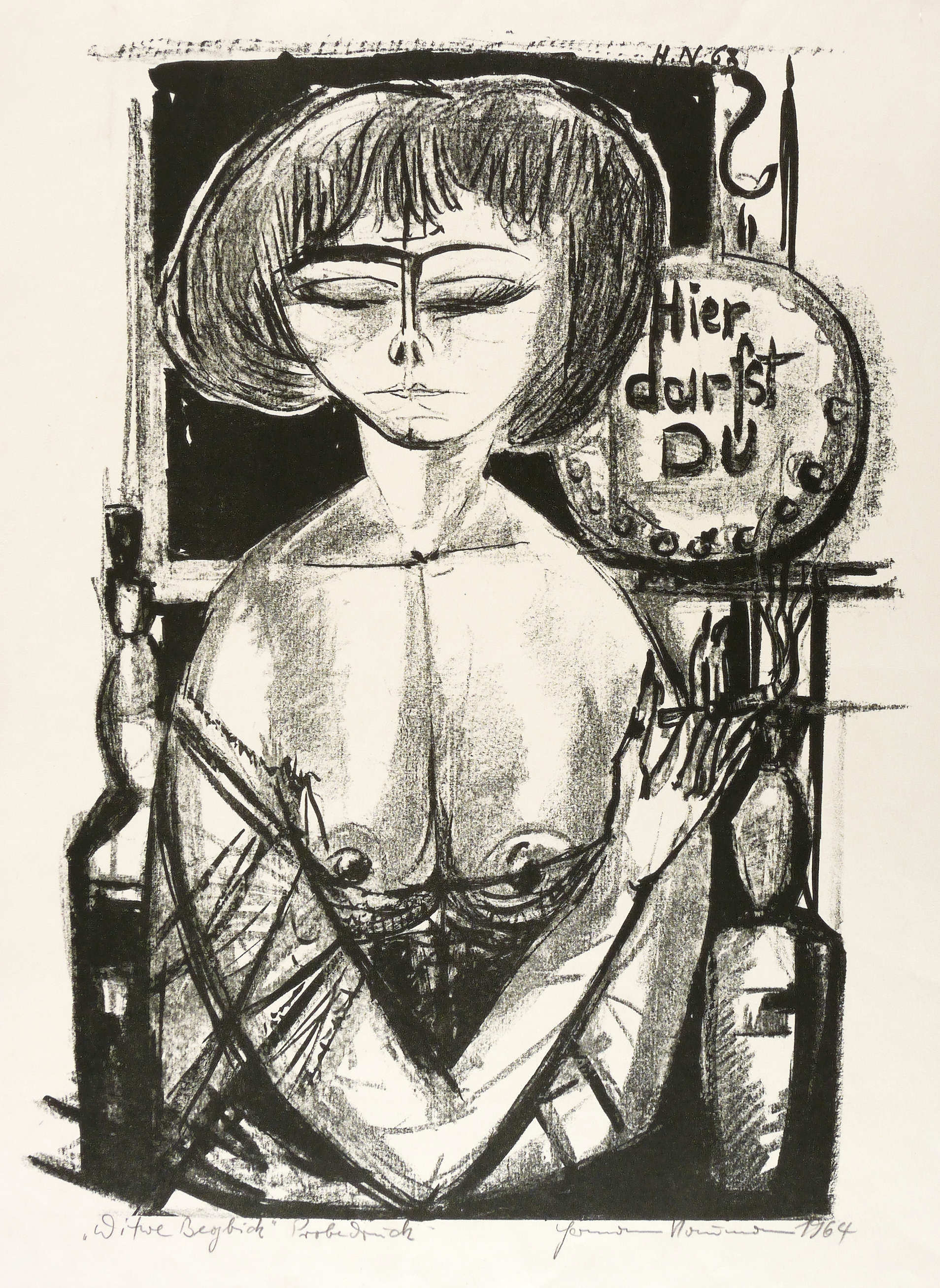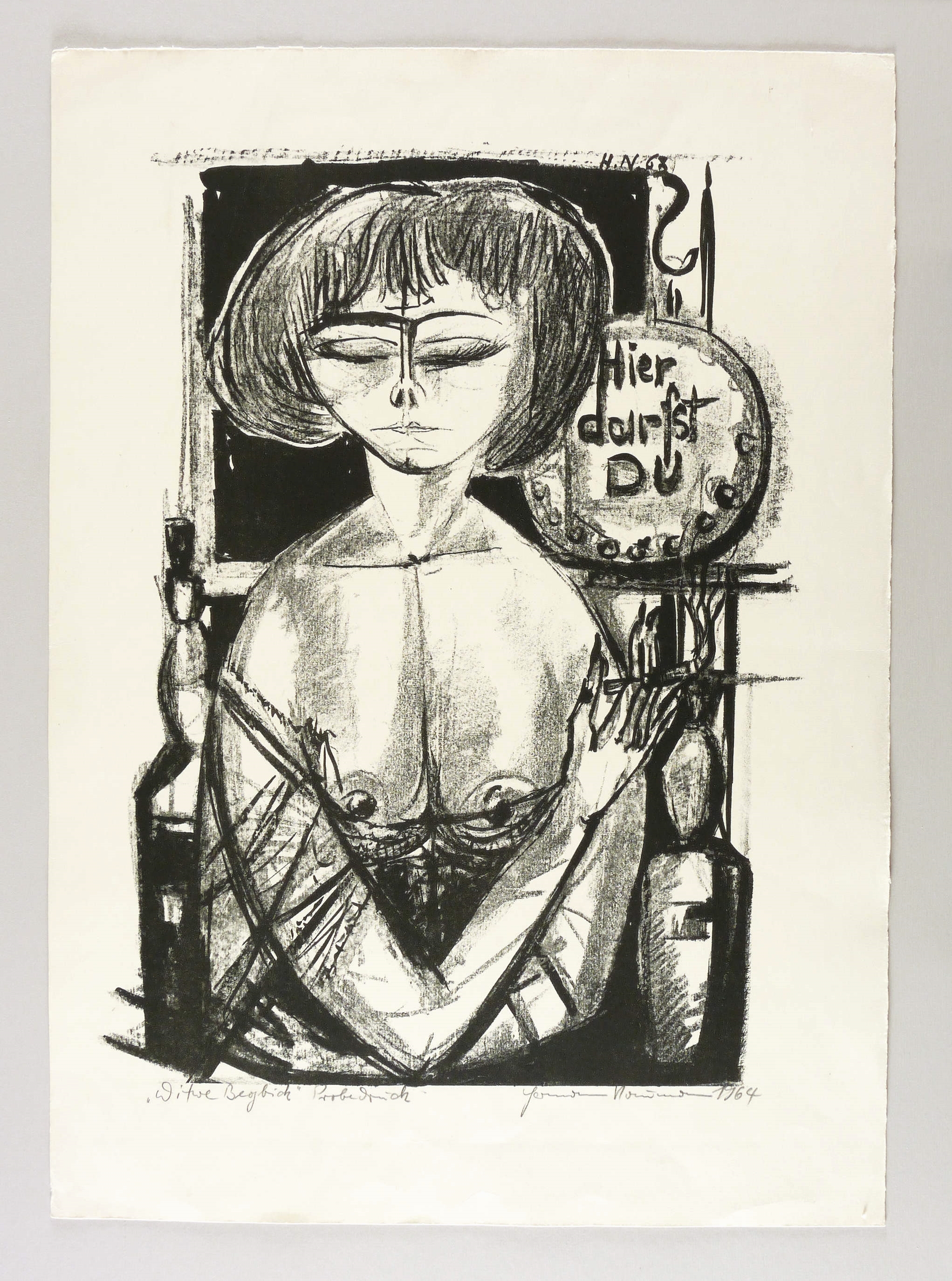 Rechts unten in Bleistift signiert und datiert: ″Hermann Naumann 1964″. Links Titel und Auflagenbezeichnung: ″Witwe Begbick / Probedruck″. Im Stein rechts oben abweichend Signatur und Jahr: ″H.N. 63″. Darunter Inschrift: ″Hier darfst Du″. – Durchgehend leichte Lagerspuren. Unterer Rand rechts etwas bestoßen. Sonst ohne Mängel. Insgesamt guter Zustand.