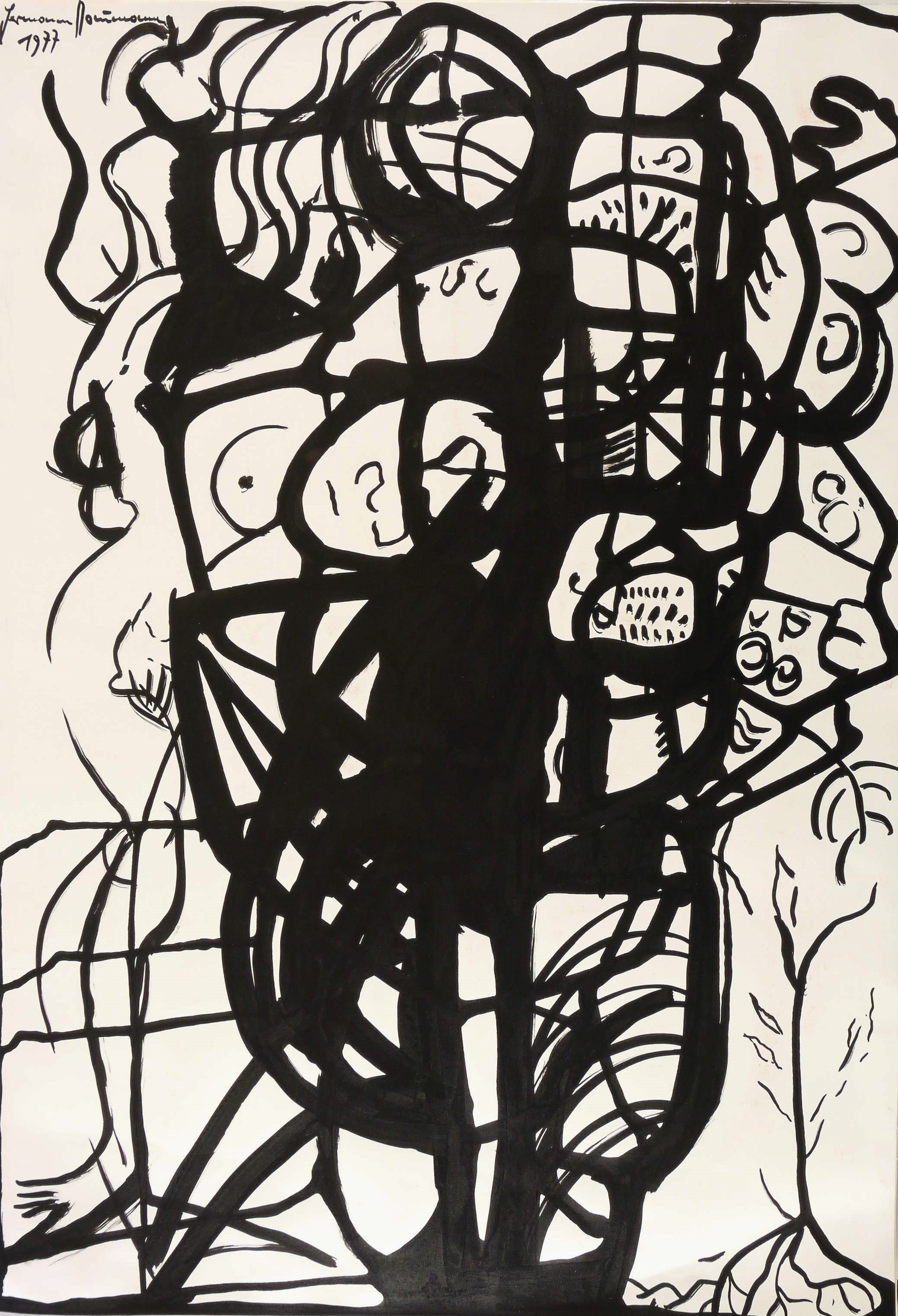 1977. Zeichnung / Pinselzeichnung, in schwarzer Tusche, auf glattem hellchamois Velinkarton. – Originale Künstlergrafik, von Hermann Naumann. – Unikat. – 73,5 x 51,0 cm (Darstellung / Blatt).