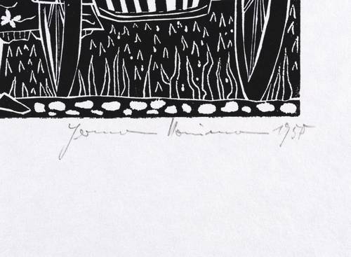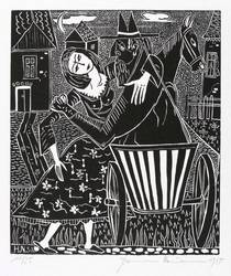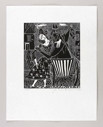 Rechts unten in Bleistift signiert und datiert: ″Hermann Naumann 1958″. Links Auflagenbezeichnung: ″11/25″. Im Druckstock rechts unten Signatur und Jahr: ″H.N. 58.″ – Aus der 12-teiligen Holzschnitt-Folge zu ″Tewje der Milchmann″ (Scholem Alejchem). – Sehr guter Zustand.