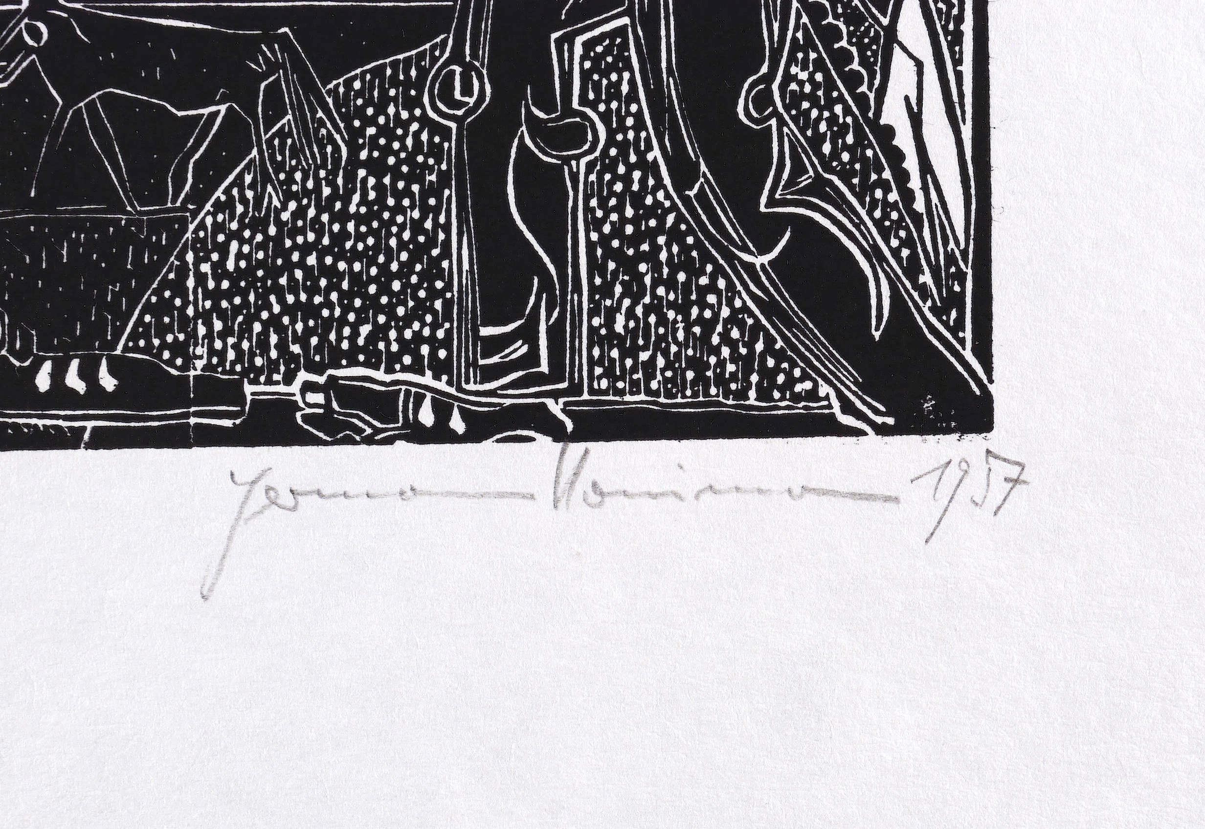 Rechts unten in Bleistift signiert und datiert: ″Hermann Naumann 1958″. Links Auflagenbezeichnung: ″11/25″. Im Druckstock links oben Signatur und Jahr: ″H.N. 57.″ – Aus der 12-teiligen Holzschnitt-Folge zu ″Tewje der Milchmann″ (Scholem Alejchem). – Sehr guter Zustand.
