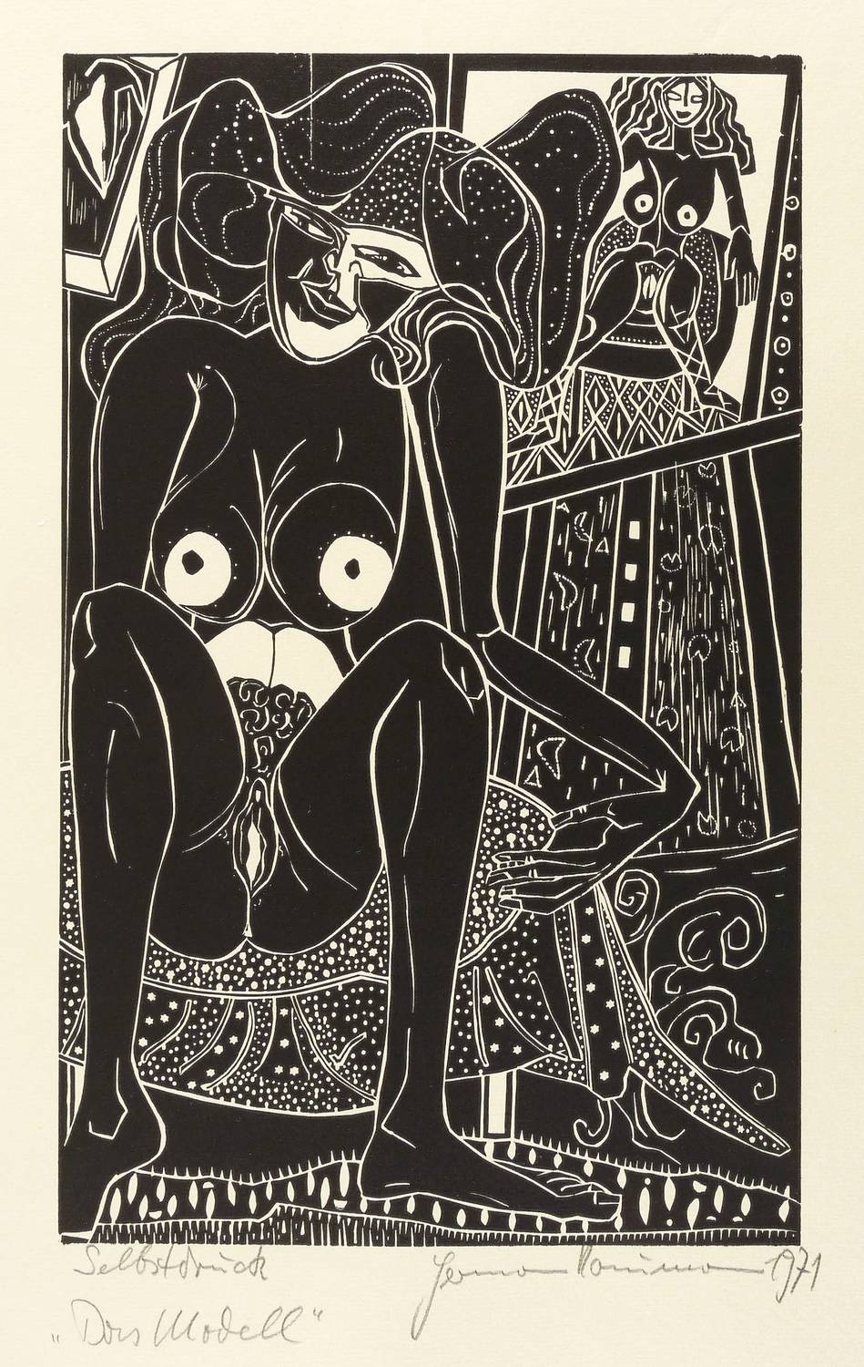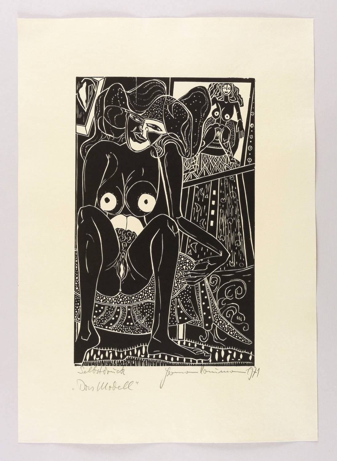 Rechts unten in Bleistift signiert und datiert: ″Hermann Naumann 1971″. Links eigenhändig bezeichnet: ″Selbstdruck / Das Modell″. – Schönes erotisches Blatt in Niello-Technik Weiß in Schwarz gearbeitet. – Sehr guter Zustand.