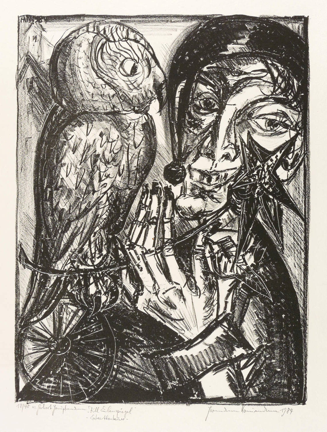 Rechts unten in Bleistift signiert und datiert: ″Hermann Naumann 1984″. Links Auflagenbezeichnung: ″18/40″. Daneben bezeichnet: ″zu Gerhart Hauptmann 'Till Eulenspiegel' Erstes Abenteuer″. Im unteren Blattrand persönliche Widmung. – Tadelloses Exemplar. Sehr guter Zustand.
