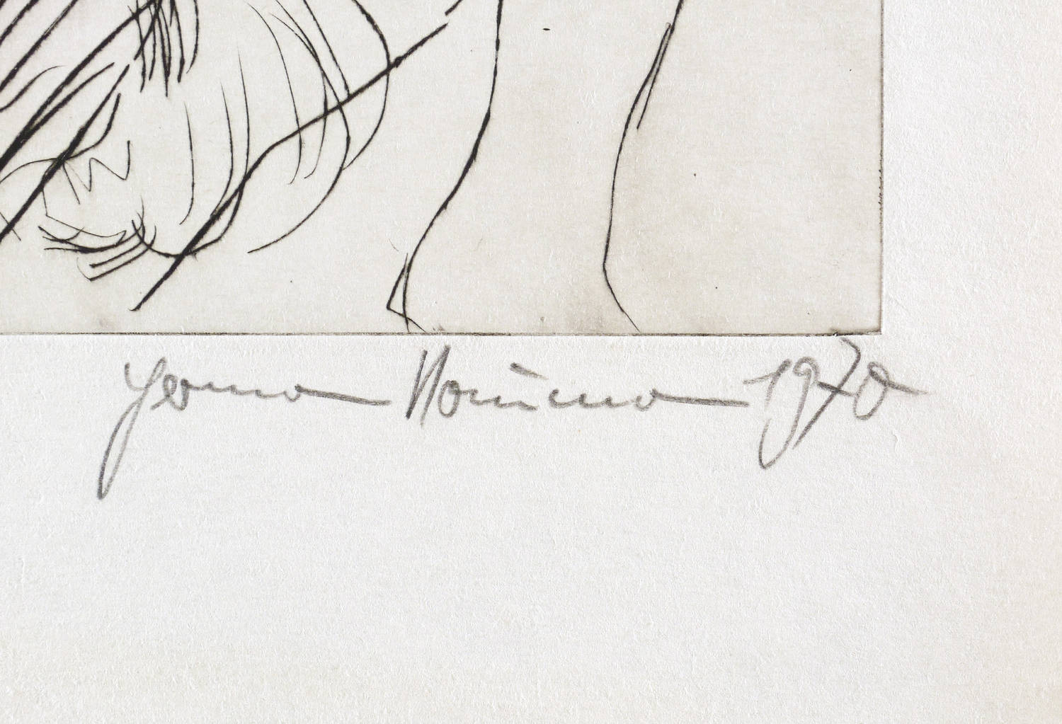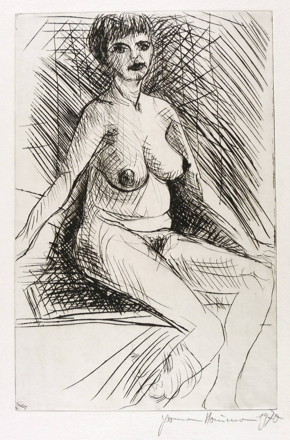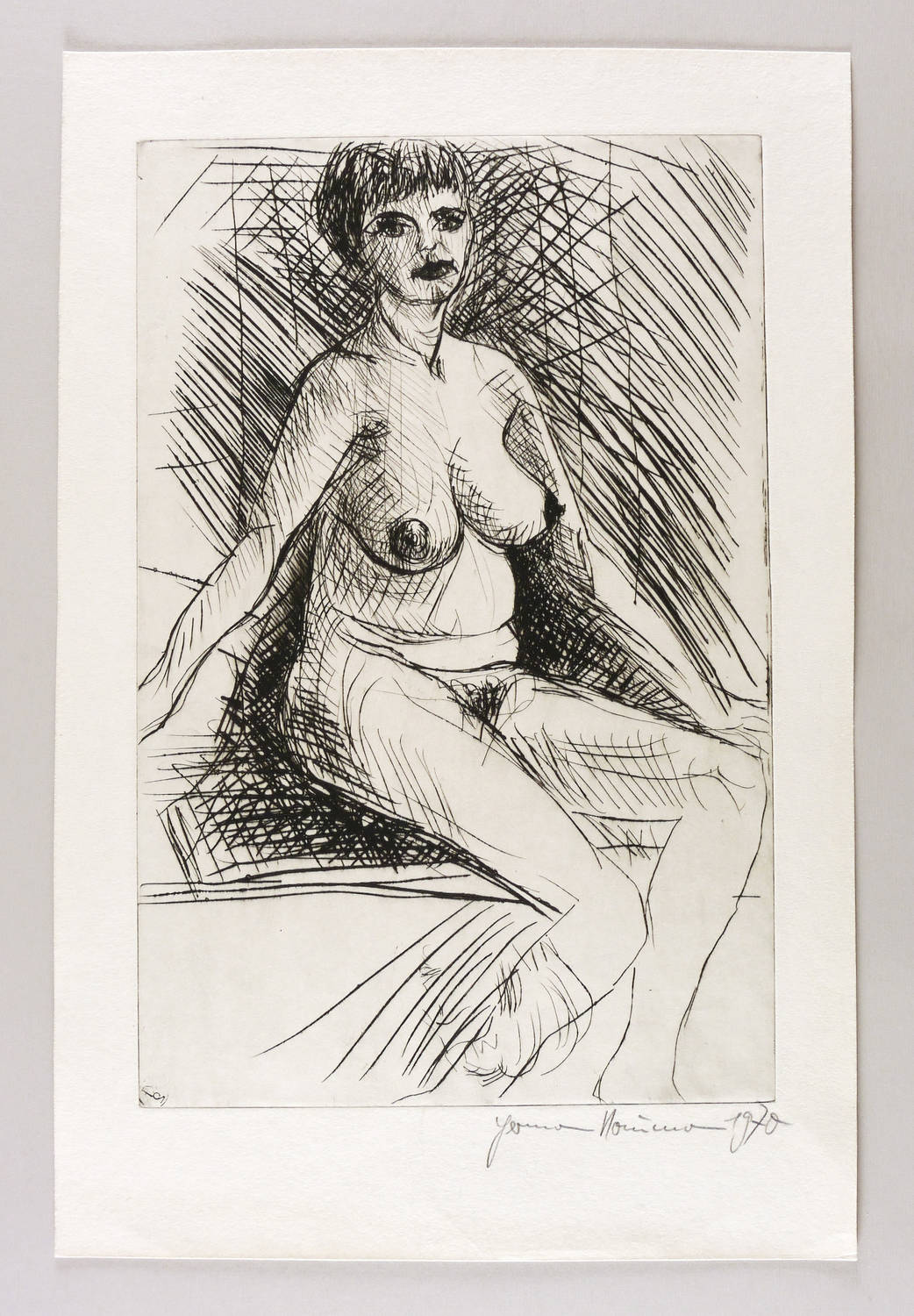 1970. Radierung / Kaltnadel, in Schwarz, auf wolkigem gelblichem Velin. – Originale Künstlergrafik, von Hermann Naumann. – 49,8 x 32,5 cm (Darstellung / Platte), 62 x 41 cm (Blatt).