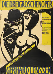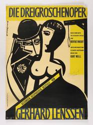 In der Druckform links oben Signatur und Jahr: ″Hermann Naumann 61″. Inschrift: ″DIE DREIGROSCHENOPER // GESUNGEN, GESPROCHEN, GESPIELT VON GERHARD LENSSEN // NACH JOHN GAY'S THE BEGGAR'S OPERA VON BERTOLT BRECHT // UNTER MITARBEIT VON ELISABETH HAUPTMANN MUSIK VON KURT WEILL″. Links unten Druckeradresse der Druckerei Maume in Radebeul. Am rechten Rand in Kugelschreiber von Gerhard Lenssen signiert. – Plakat zur Aufführung der Dreigroschenoper im ″Ein-Mann-Theater″ von Gerhard Lenssen in Dresden 1961. – Die Blattecken mit Mängeln, Reißzwecklöchlein, rechts oben Papierverlust, die übrigen Ecken alt mit transparentem Klebeband. Insgesamt mangelhafter Zustand.