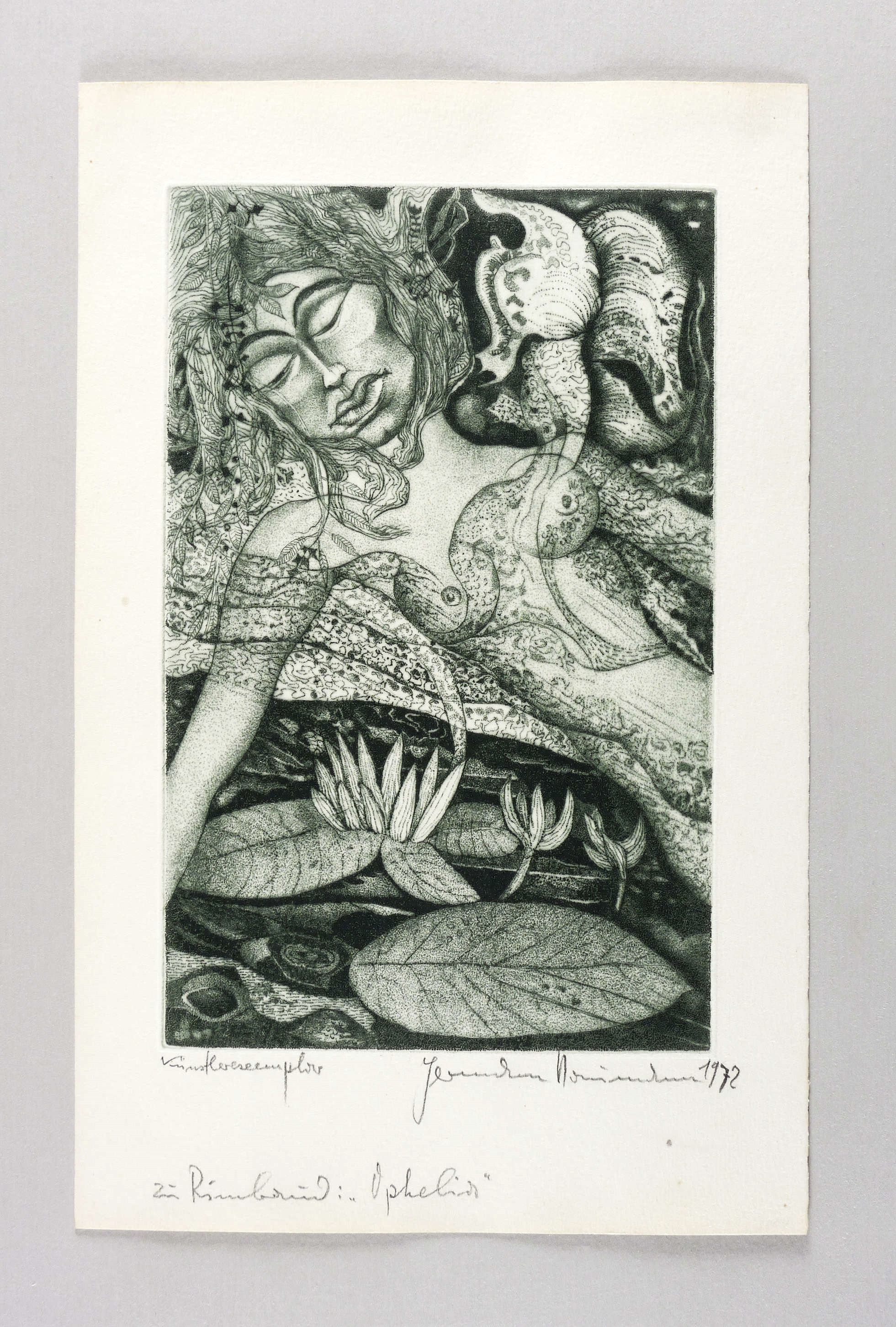 Aus: Hermann Naumann, Arthur Rimbaud. Gedichte (Leipzig: Philipp Reclam jun. 1976). – Rechts unten in Bleistift signiert und datiert: ″Hermann Naumann 1972″. Links Auflagenbezeichnung. In der linken unteren Blattecke bezeichnet: ″zu Rimbaud: Ophelia″. – Im unteren Rand zwei kleine unscheinbare Fleckchen. Insgesamt guter Zustand.