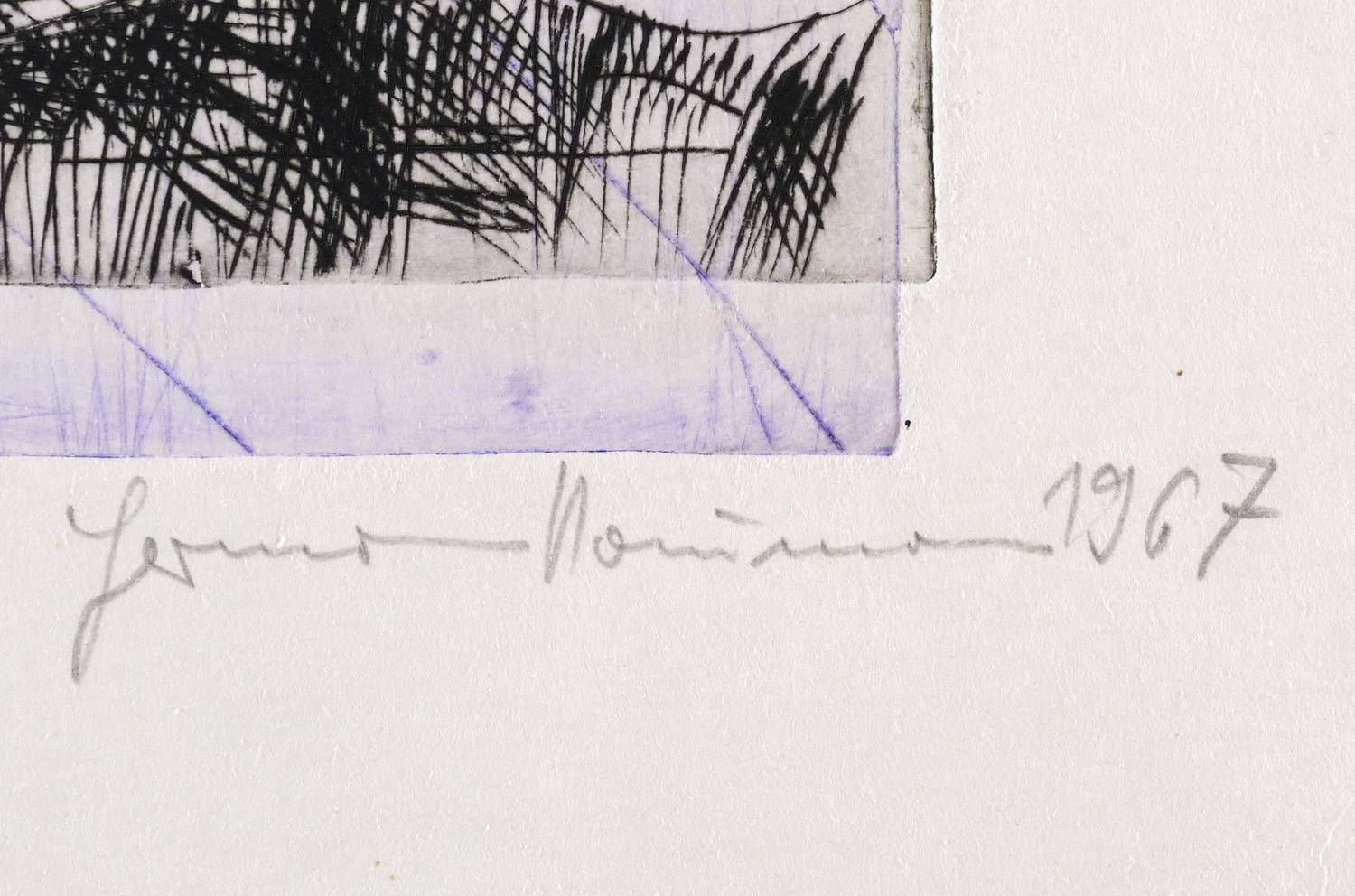 1967. Radierung / Kaltnadel, in Schwarz, mit Tonplatte in Violett, auf Velinkarton. – Originale Künstlergrafik, von Hermann Naumann. – Probedruck. – 15,9 x 24,1 cm (Darstellung / Platte), 25 x 38 cm (Blatt).