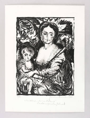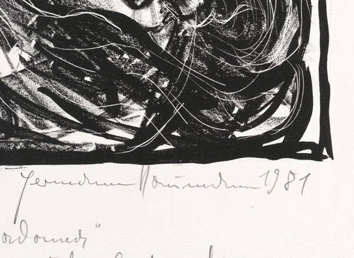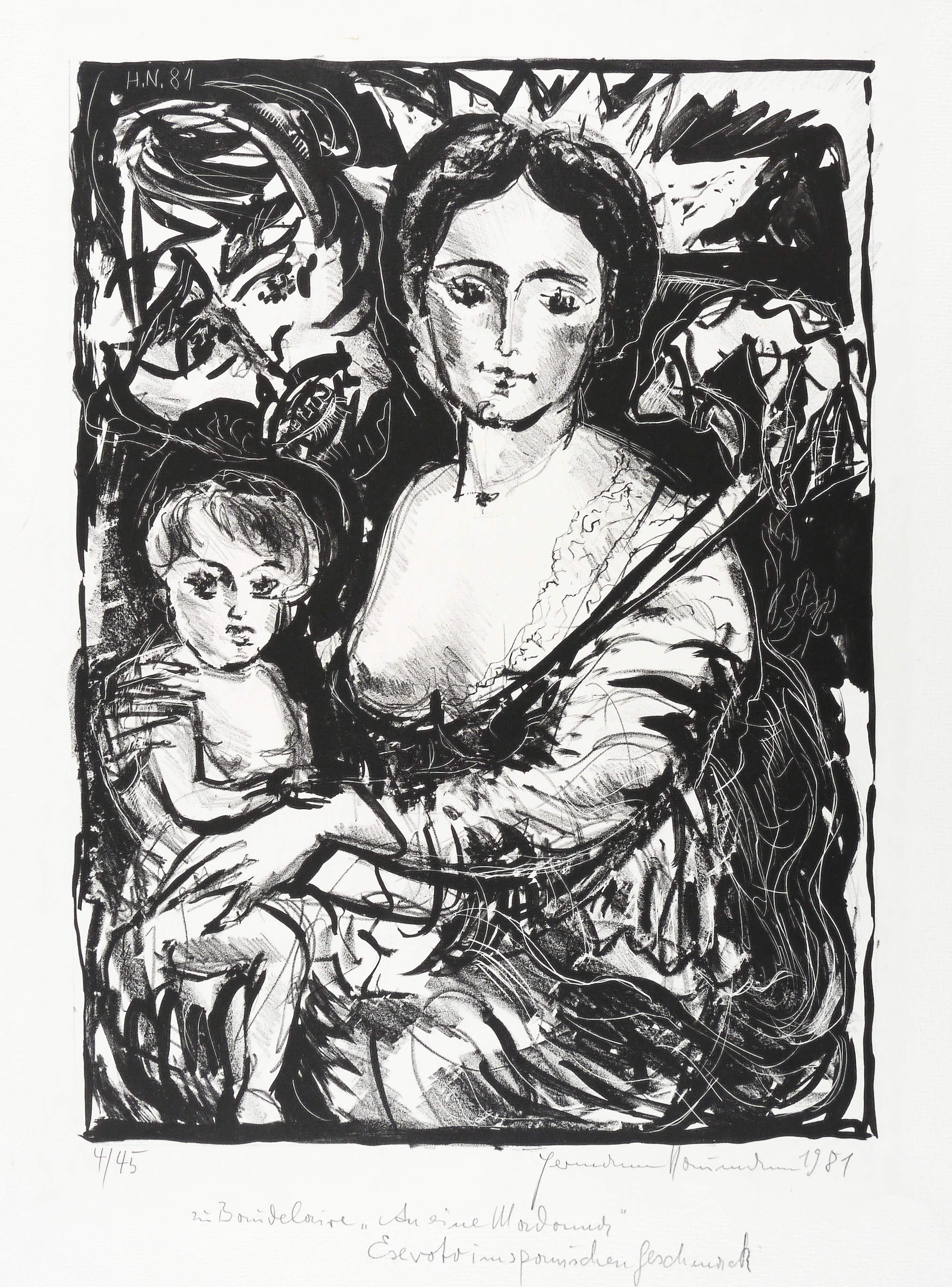 Rechts unten in Bleistift signiert und datiert: ″Hermann Naumann 1981″. Links eigenhändige Auflagenbezeichnung. Unterhalb ausführlich bezeichnet: ″zu Baudelaire 'An einem Madonna' / Exvoto im spanischen Geschmack″. Im Stein links oben zusätzlich Monogramm und Jahr. – Unscheinbare Knickspuren im äußeren Papierrand. Sonst tadellos erhalten. Guter bis sehr guter Zustand.