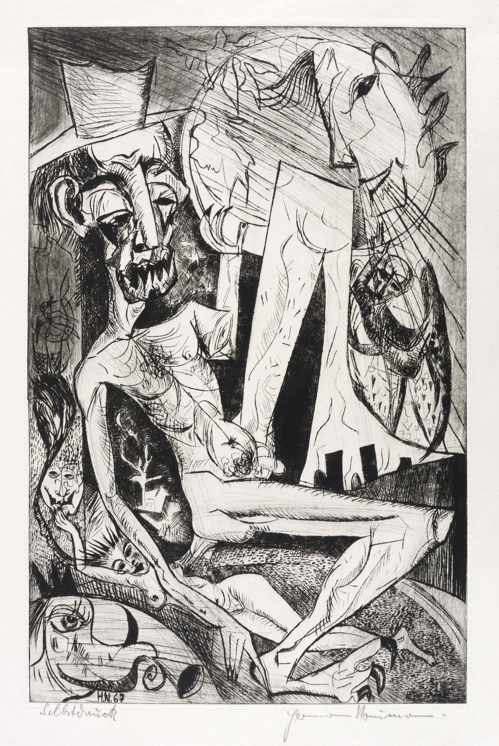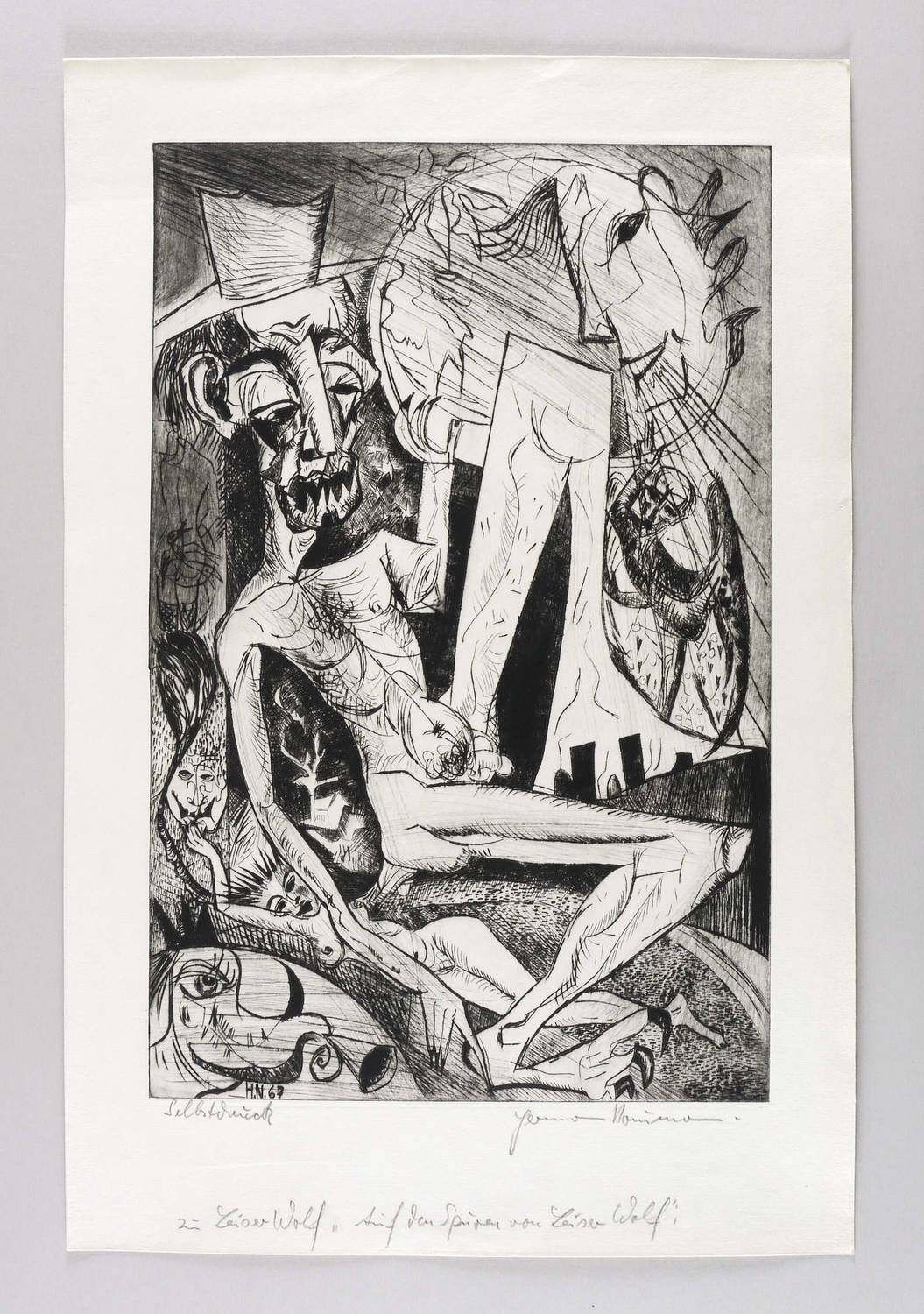 Rechts unten in Bleistift signiert: ″Hermann Naumann″. Links bezeichnet: ″Selbstdruck″. Im unteren Blattrand betitelt: ″zu Leiser Wolf 'Auf den Spuren von Leiser Wolf'″. In der Platte links unten Signatur und Jahr: ″H.N. 67″. – Handabzug des Künstlers. – Tadellos. Sehr guter Zustand.