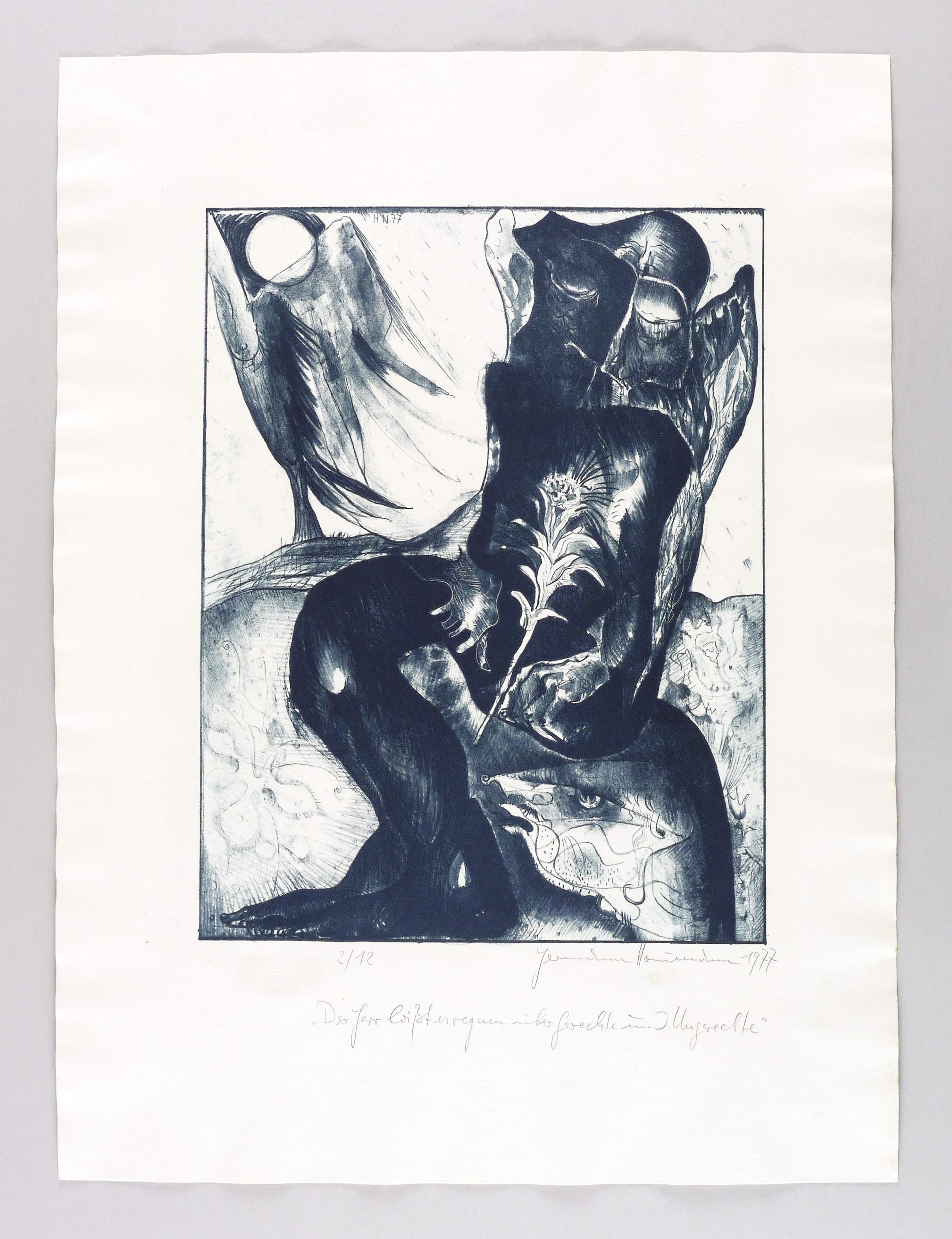 1977. Lithografie / Kreidelithografie, in Blauschwarz, auf gehämmertem hellgelbem Velinkarton. – Originale Künstlergrafik, von Hermann Naumann. – Auflage Exemplar Nr. 2/12. – 42,2 x 32,4 cm (Darstellung / Druckbild), 65 x 49 cm (Blatt).