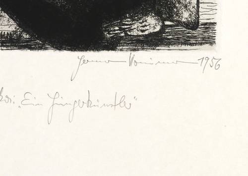 Rechts unten in Bleistift signiert und datiert: ″Hermann Naumann 1956″. Links Auflagenbezeichnung: ″5/20″. Darunter Titel: ″zu F. Kafka: 'Ein Hungerkünstler'″. – Unbeschnittenes originalrandiges Exemplar. Am linken unteren Plattenrand zwei kleine schwach ausgeprägte Fleckchen. Sonst ohne Mängel. Mäßig guter Zustand.