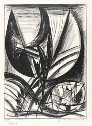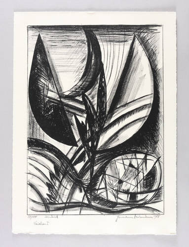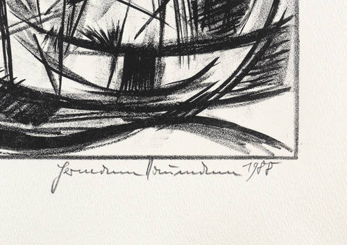 Aus: Hermann Naumann, Ich atme mächtige Züge des Raumes ein. Grafik-Edition XXXI (Leipzig: Reclam 1990). – Rechts unten in Bleistift signiert und datiert: ″Hermann Naumann 1988″. Links Auflagen- und Technikbezeichnung: ″59/100 // Steindruck″. Dazu Titel: ″Variation I″. – Tadellos erhalten. Sehr guter Zustand.