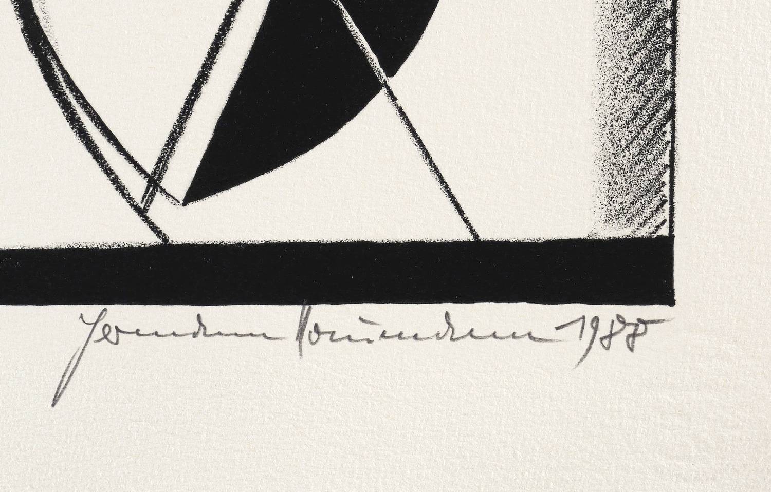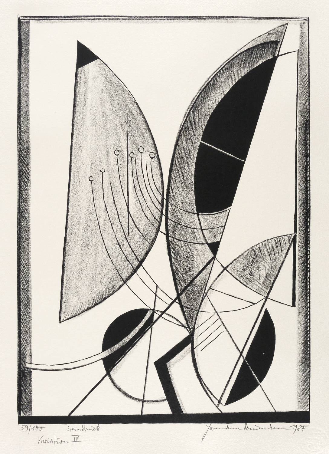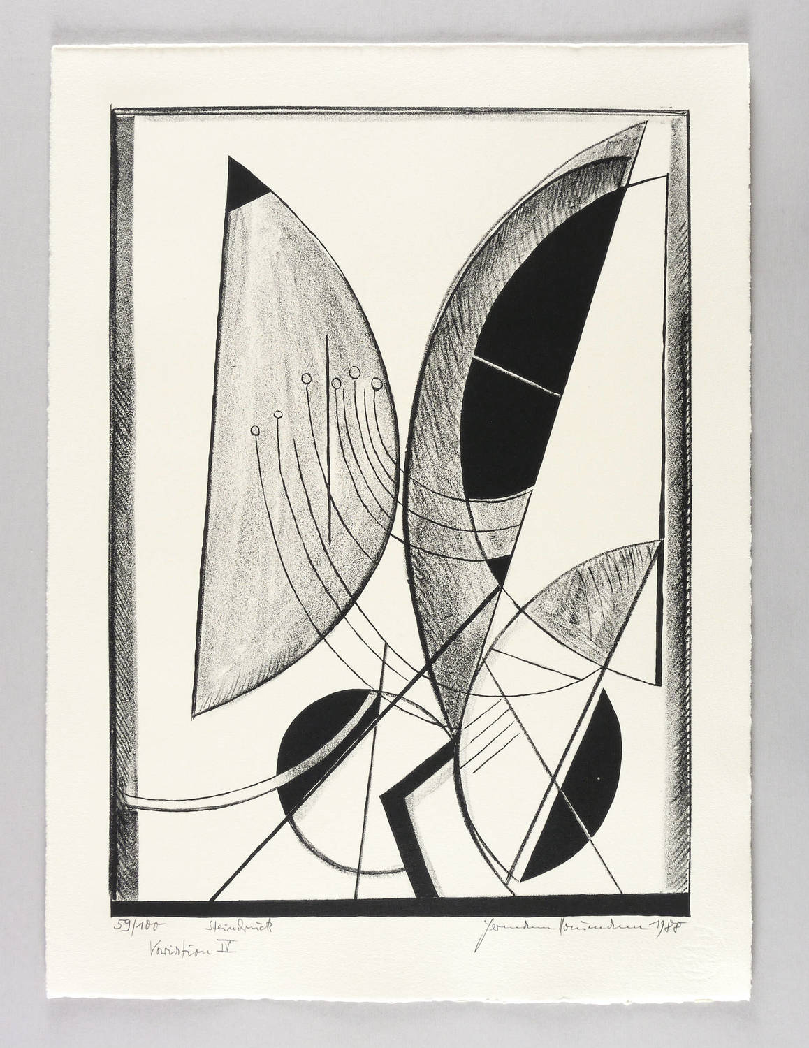Aus: Hermann Naumann, Ich atme mächtige Züge des Raumes ein. Grafik-Edition XXXI (Leipzig: Reclam 1990). – Rechts unten in Bleistift signiert und datiert: ″Hermann Naumann 1988″. Links Auflagen- und Technikbezeichnung: ″59/100 // Steindruck″. Dazu Titel: ″Variation IV″. Wasserzeichen der Hahnemühle. – Tadellos erhalten. Sehr guter Zustand.