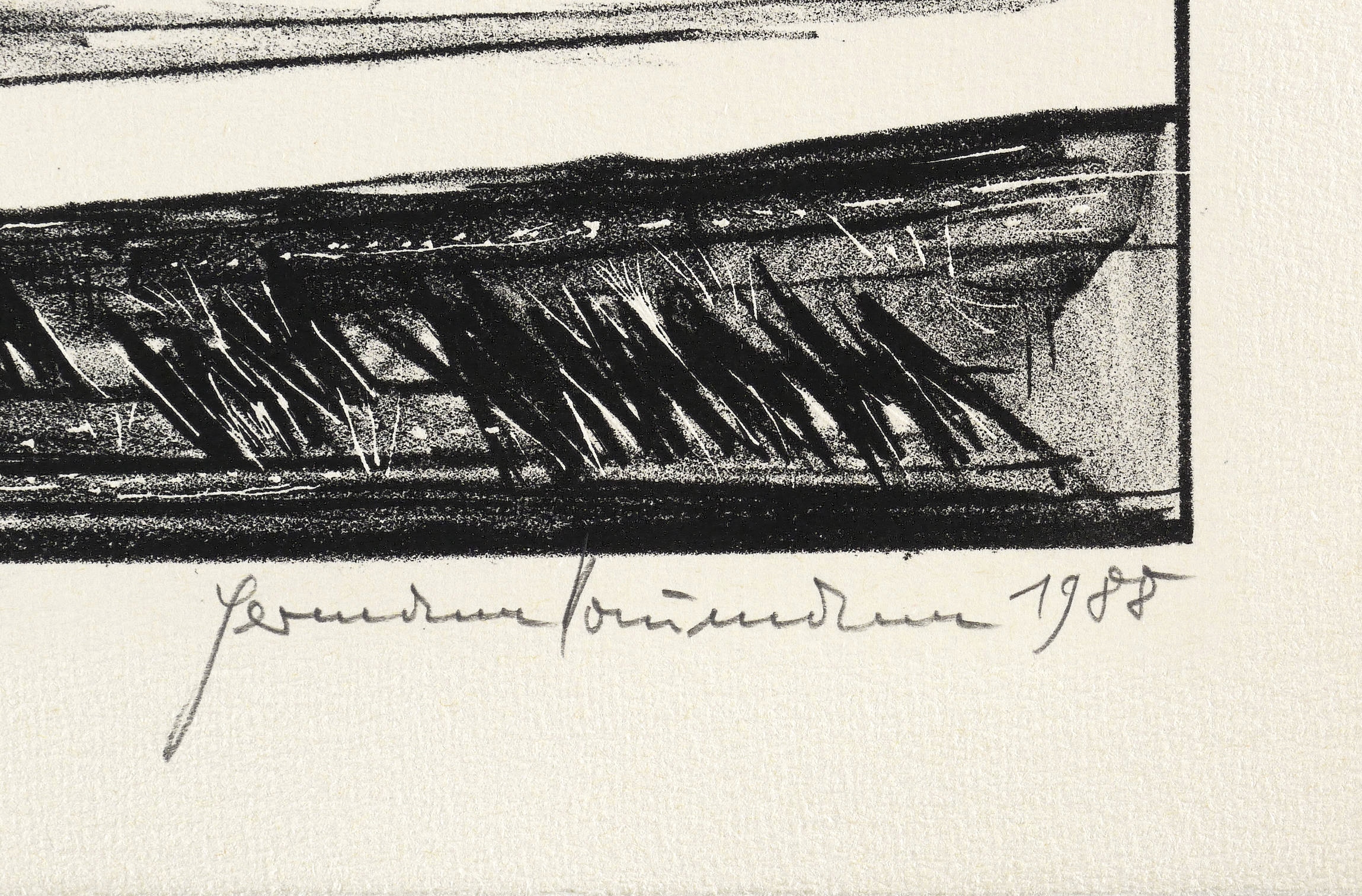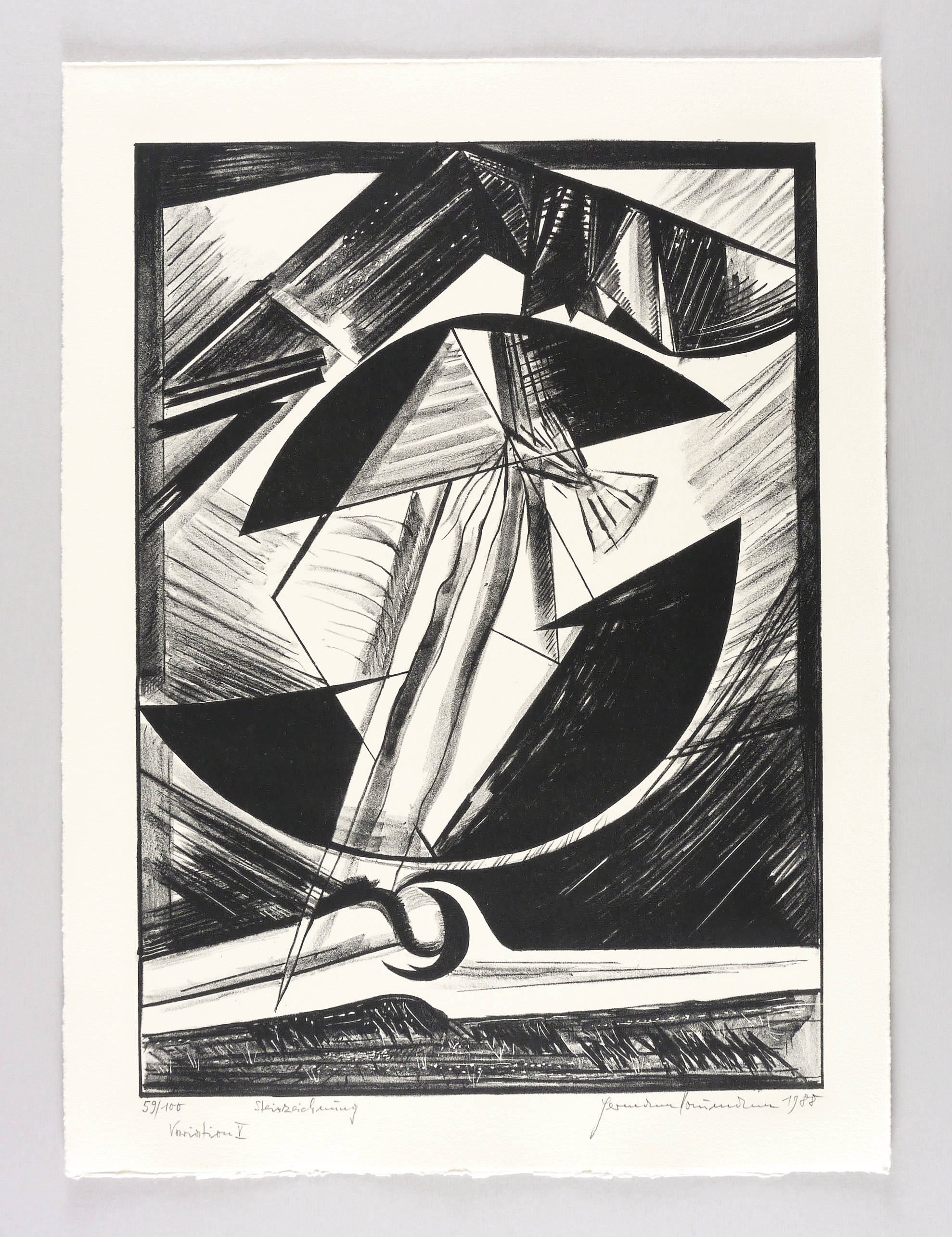 Aus: Hermann Naumann, Ich atme mächtige Züge des Raumes ein. Grafik-Edition XXXI (Leipzig: Reclam 1990). – Rechts unten in Bleistift signiert und datiert: ″Hermann Naumann 1988″. Links Auflagen- und Technikbezeichnung: ″59/100 // Steindruck″. Dazu Titel: ″Variation V″. Wasserzeichen der Hahnemühle. – Tadellos erhalten. Sehr guter Zustand.
