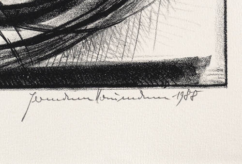 Aus: Hermann Naumann, Ich atme mächtige Züge des Raumes ein. Grafik-Edition XXXI (Leipzig: Reclam 1990). – Rechts unten in Bleistift signiert und datiert: ″Hermann Naumann 1988″. Links Auflagen- und Technikbezeichnung: ″59/100 // Steindruck″. Dazu Titel: ″Variation VI″. – Tadellos erhalten. Sehr guter Zustand.