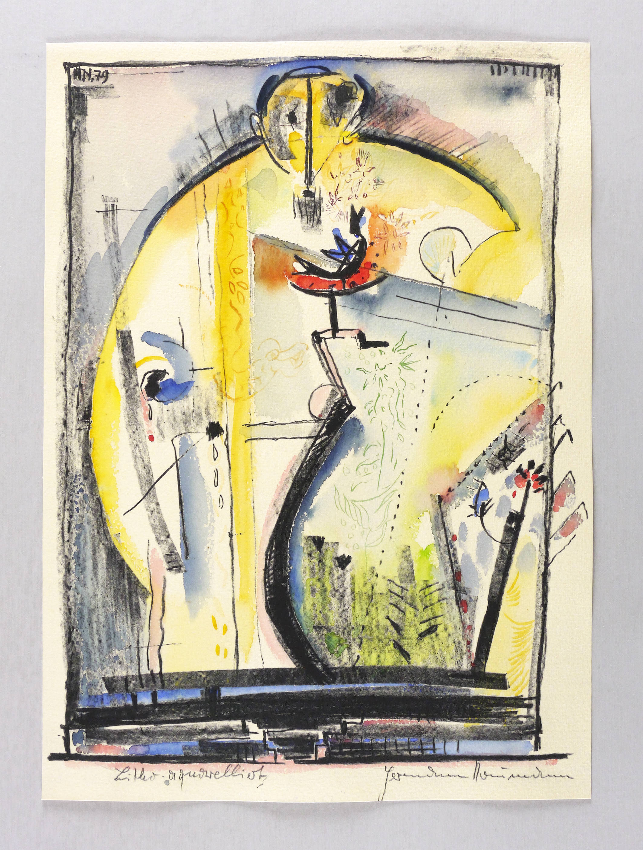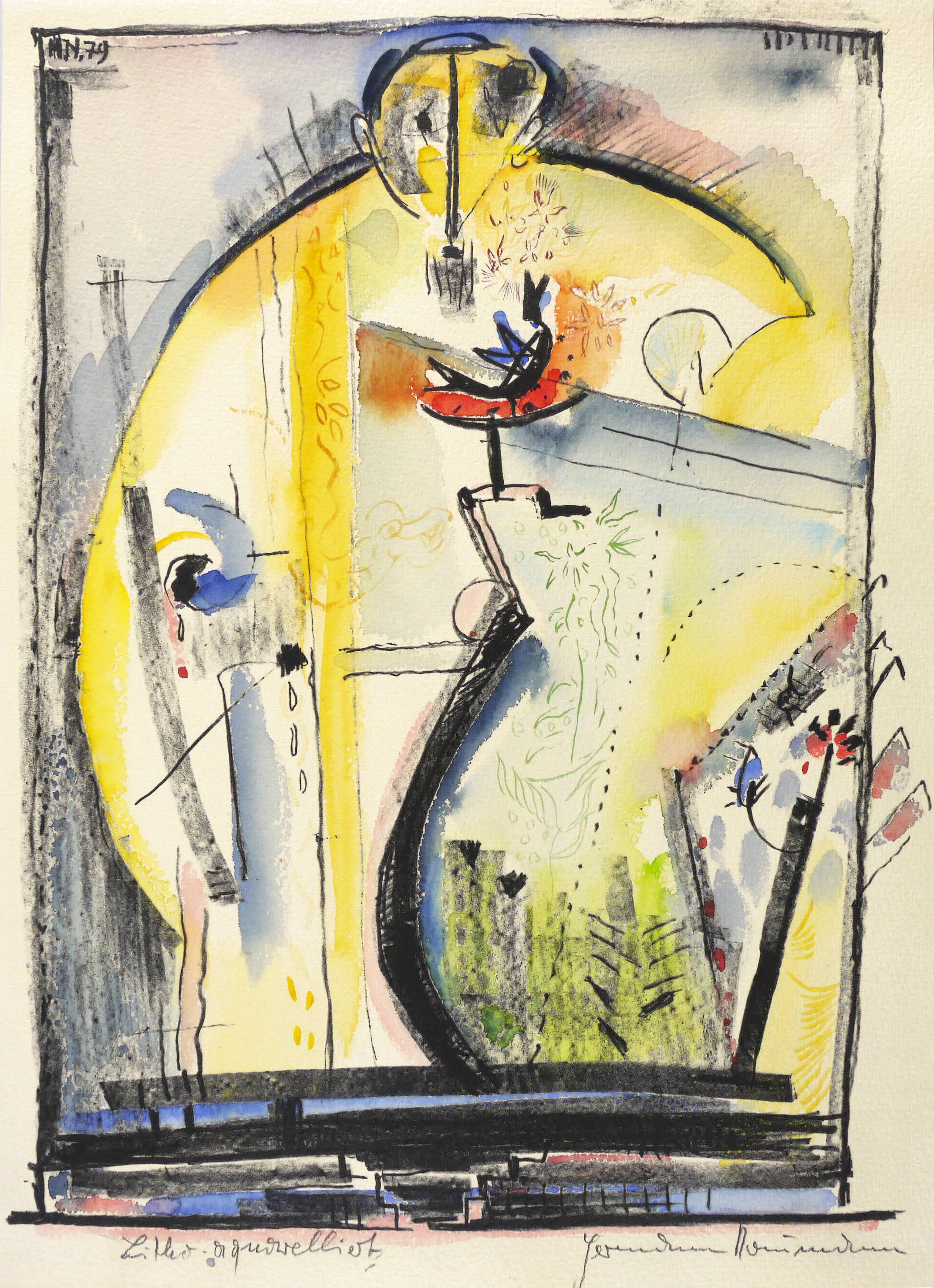 1979. Lithografie / Kreide- & Federlithografie, in Schwarz, aquarelliert, auf hellchamois Weißenborn. – Originale Künstlergrafik, von Hermann Naumann. – Unikat. – 37,5 x 28,5 cm (Darstellung / Druckbild), 41 x 30 cm (Blatt).