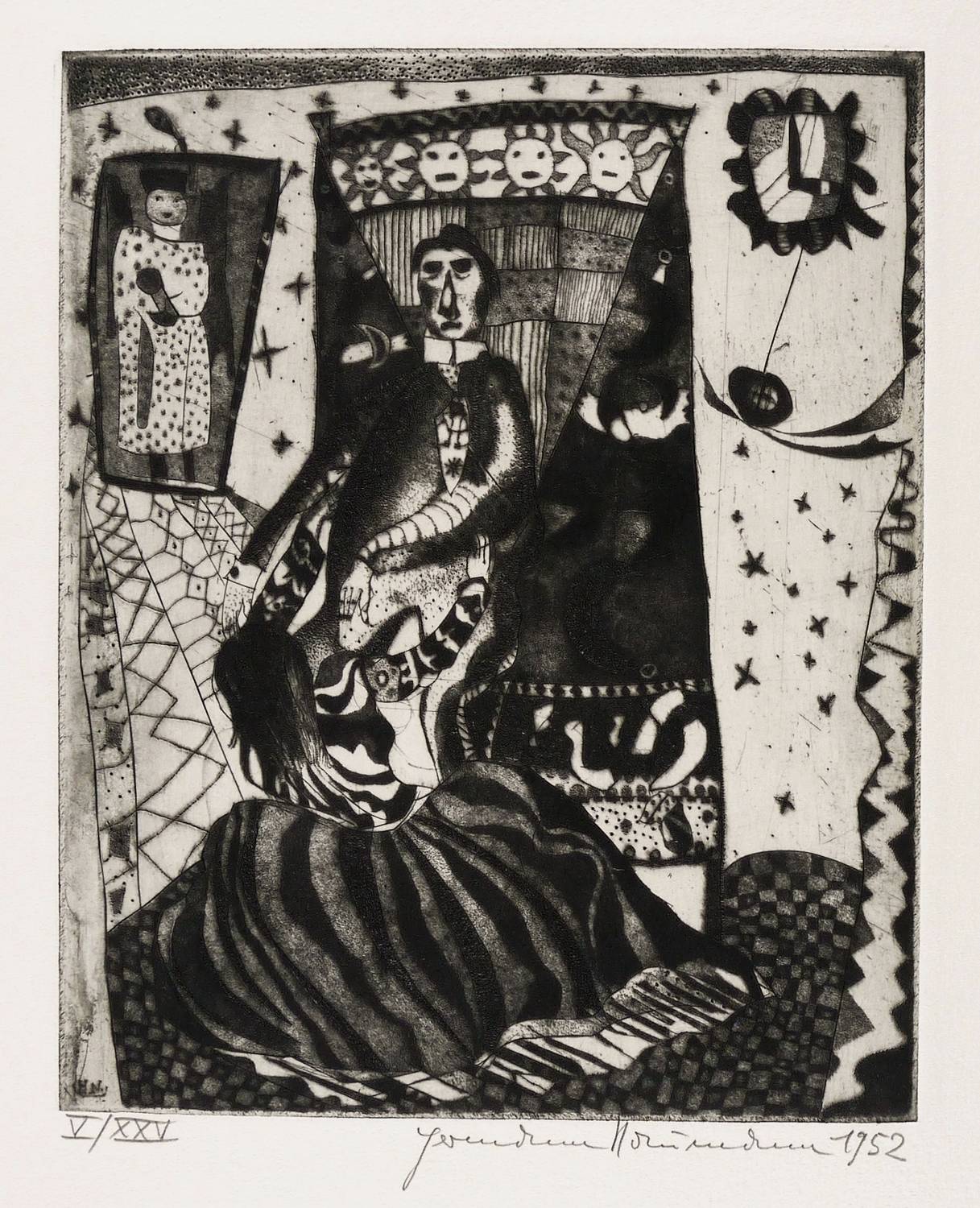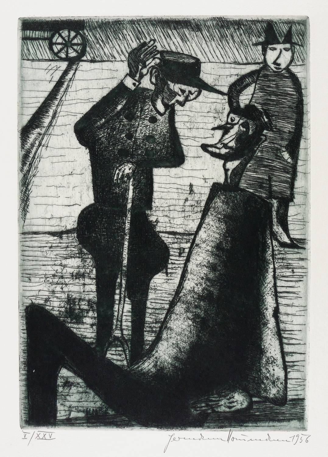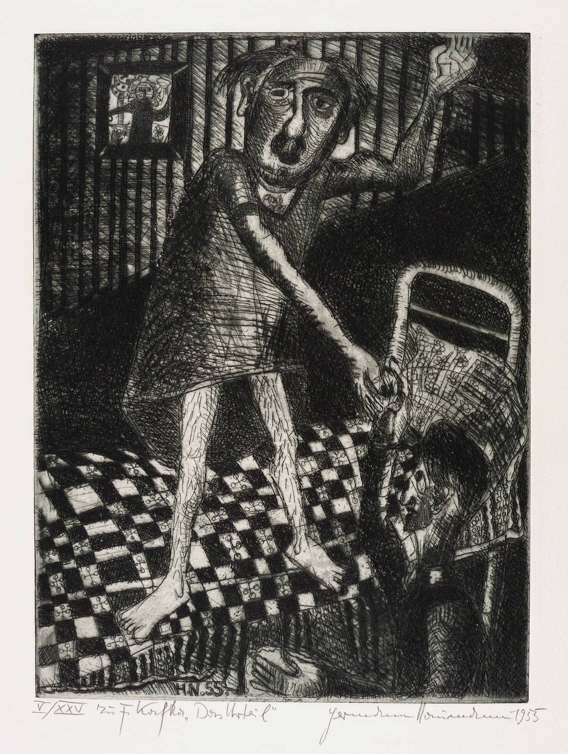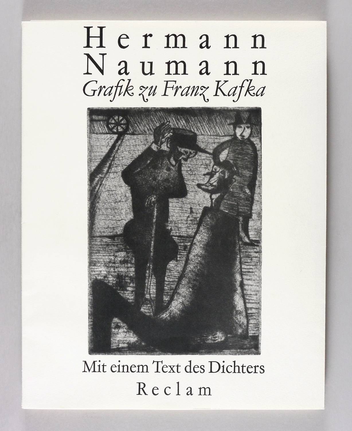 Aus: Hermann Naumann, Grafik zu Franz Kafka. Grafik-Edition XXI (Leipzig: Reclam 1985). – Jedes Blatt in Bleistift signiert und datiert. Links Auflagenbezeichnung. – Vollständiges Mappenwerk mit allen 8 Punzenstichen, enthaltend: Der Hungerkünstler. Das Urteil. Vor dem Gesetz. Leni (Der Prozess). Im Dom (Der Prozess). Hinrichtung (Der Prozess). Die Verwandlung. Ein Bericht für eine Akademie. – Edition von 1985 im Verlag Philipp Reclam jun. Leipzig. Die Platten selbst entstanden schon in den Jahren 1952 bis 1956. – Mit allen Grafiken, Textblättern, Impressum, Umschlag und Schuber vollständig erhalten. Sehr guter Zustand.