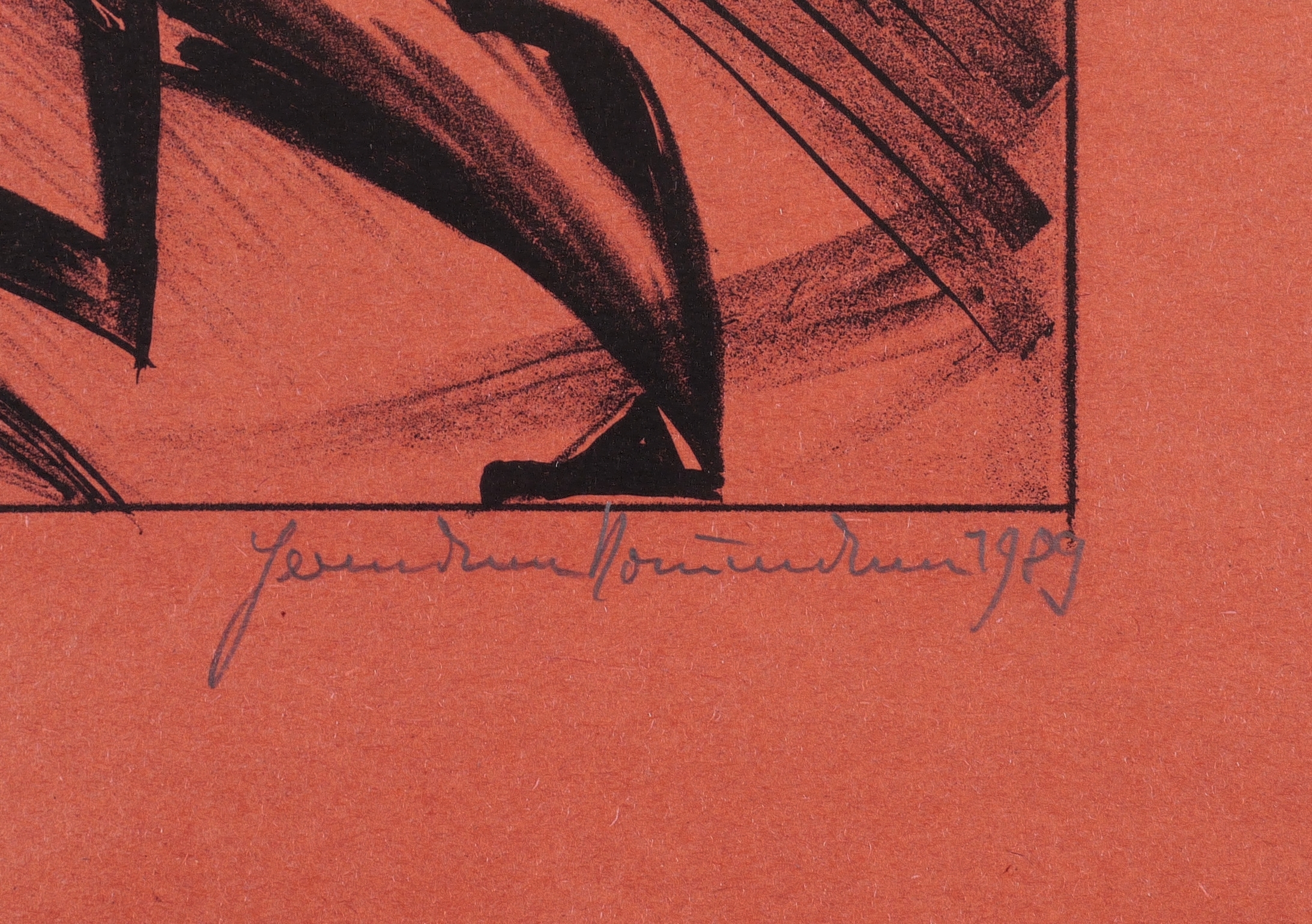 1989. Lithografie / Kreidelithografie, in Schwarz, auf glattem rotbraunem Tonkarton. – Originale Künstlergrafik, von Hermann Naumann. – 32,8 x 23,2 cm (Darstellung / Druckbild), 54 x 40 cm (Blatt).
