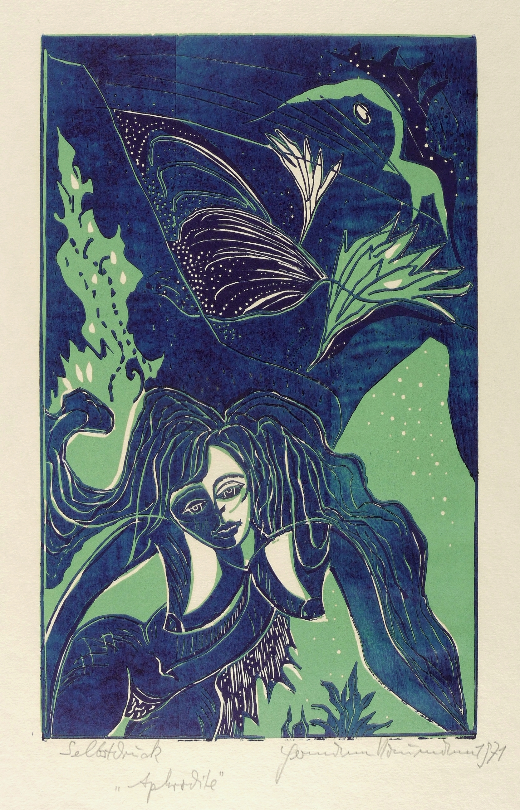 Rechts unten in Bleistift signiert und datiert: ″Hermann Naumann 1971″. Links bezeichnet: ″Selbstdruck″. Darunter mittig Titel: ″Aphrodite″. – Papier altersbedingt etwas gegilbt. Im breiten Rand minimal griffspurig. Insgesamt guter Zustand.