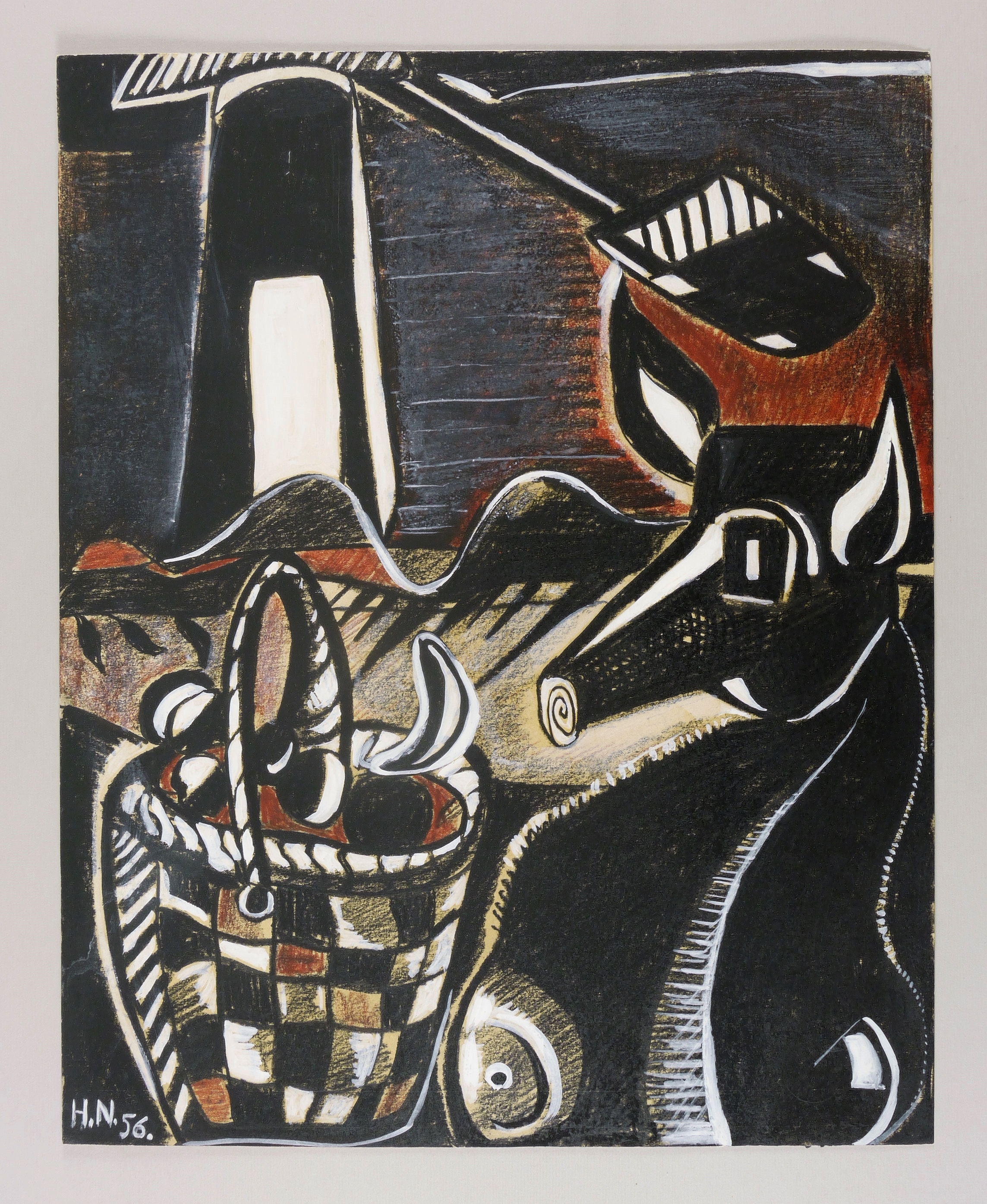 Links unten in Pinsel und Deckweiß signiert und datiert: ″H.N. 56.″ – Karton rückseitig mit leichten Montagespuren. Sehr guter Zustand.