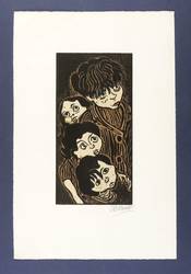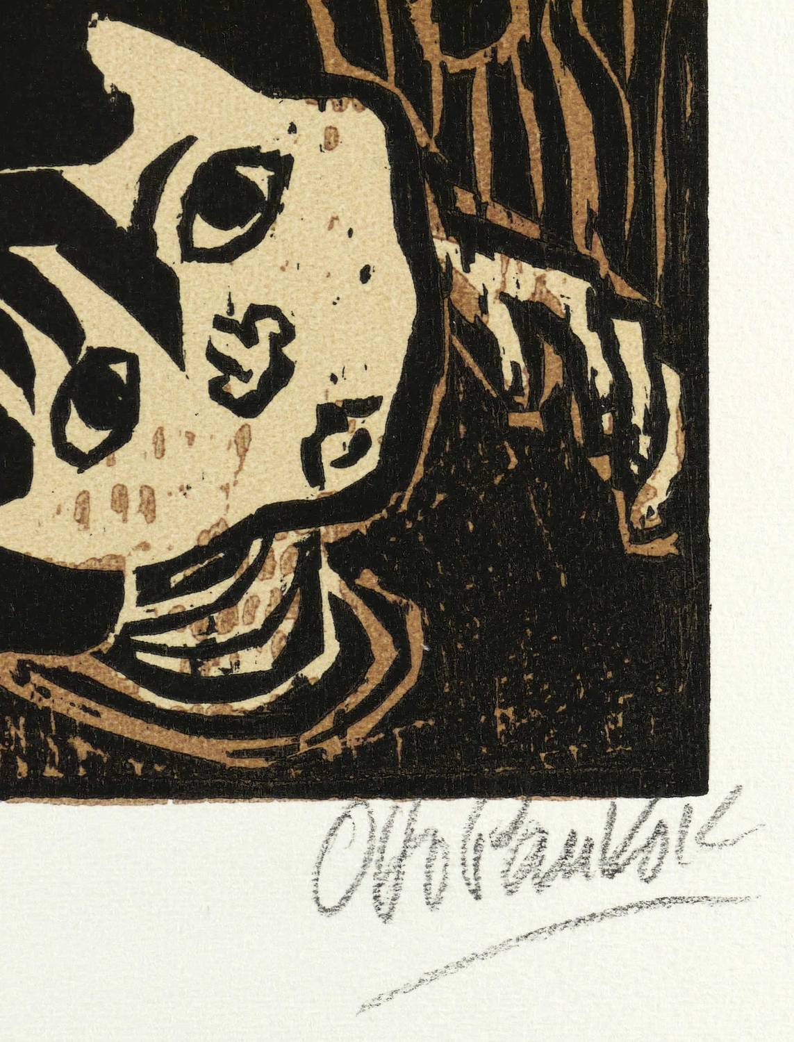 1947. Farbholzschnitt, in 3 Farben, auf hellgelbem Papier. – Originale Künstlergrafik, von Otto Pankok. – 29,7 x 15,1 cm (Darstellung / Druckstock), 49 x 32 cm (Blatt).