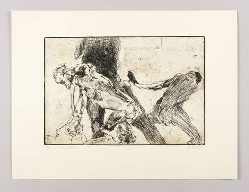 1990. Radierung / Strichätzung & Kaltnadel, in Schwarz, mit Platenton, auf chamois Hahnemühle. – Originale Künstlergrafik, von Christine Perthen. – Probedruck. – 19,3 x 28,5 cm (Darstellung / Platte), 30 x 40 cm (Blatt).