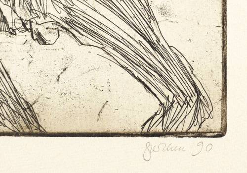 Rechts unten in Bleistift signiert und datiert: ″Perthen 90″. Links Auflagenbezeichnung: ″Probedruck / Künstlerdruck″. In der Platte links unten Inschrift: ″Camille Claudel Hommage″. – Ohne Mangel. Sehr gut erhalten.