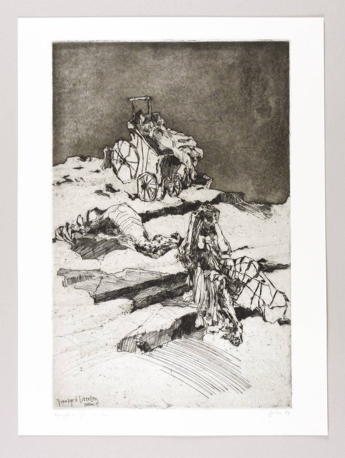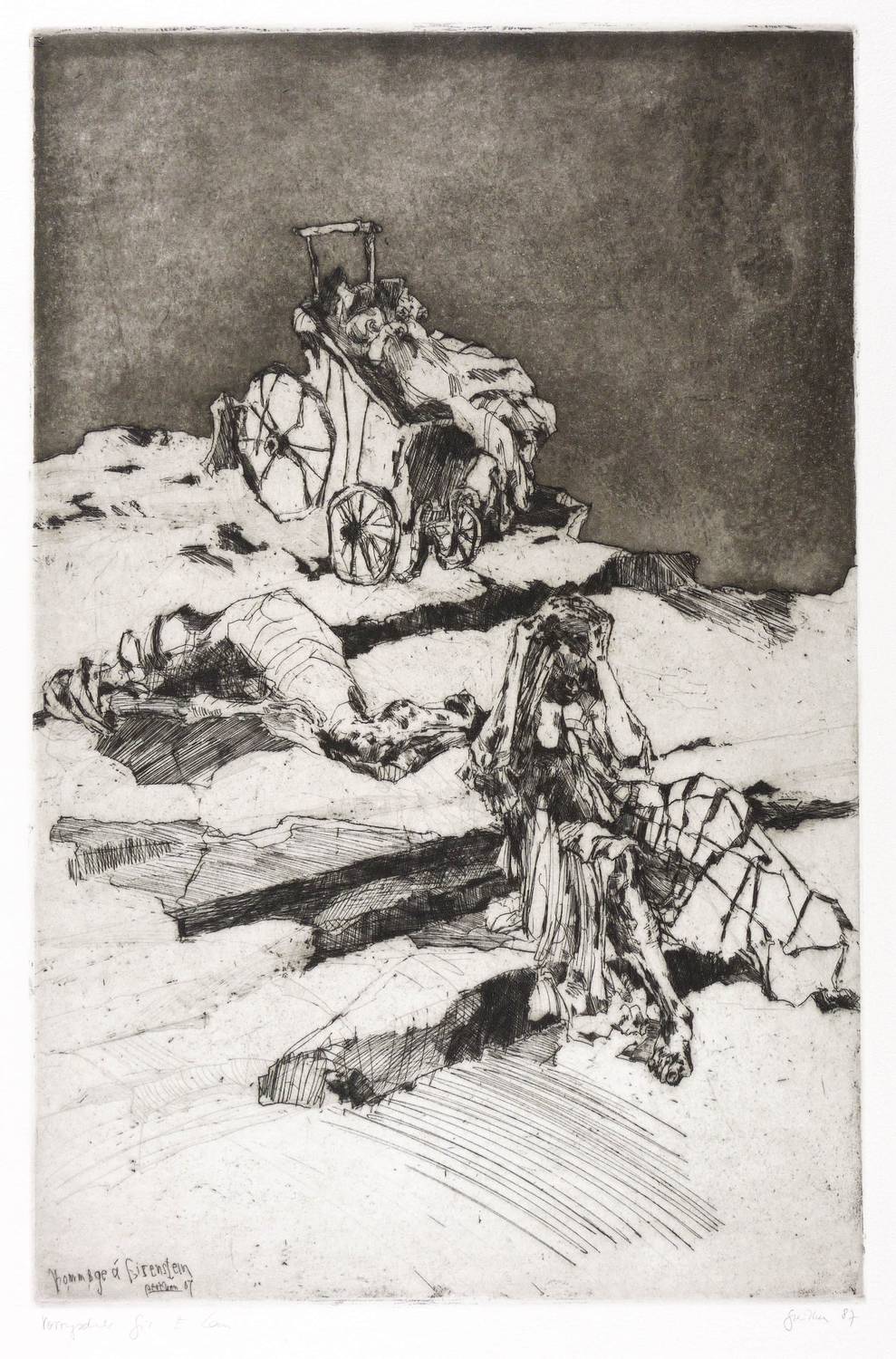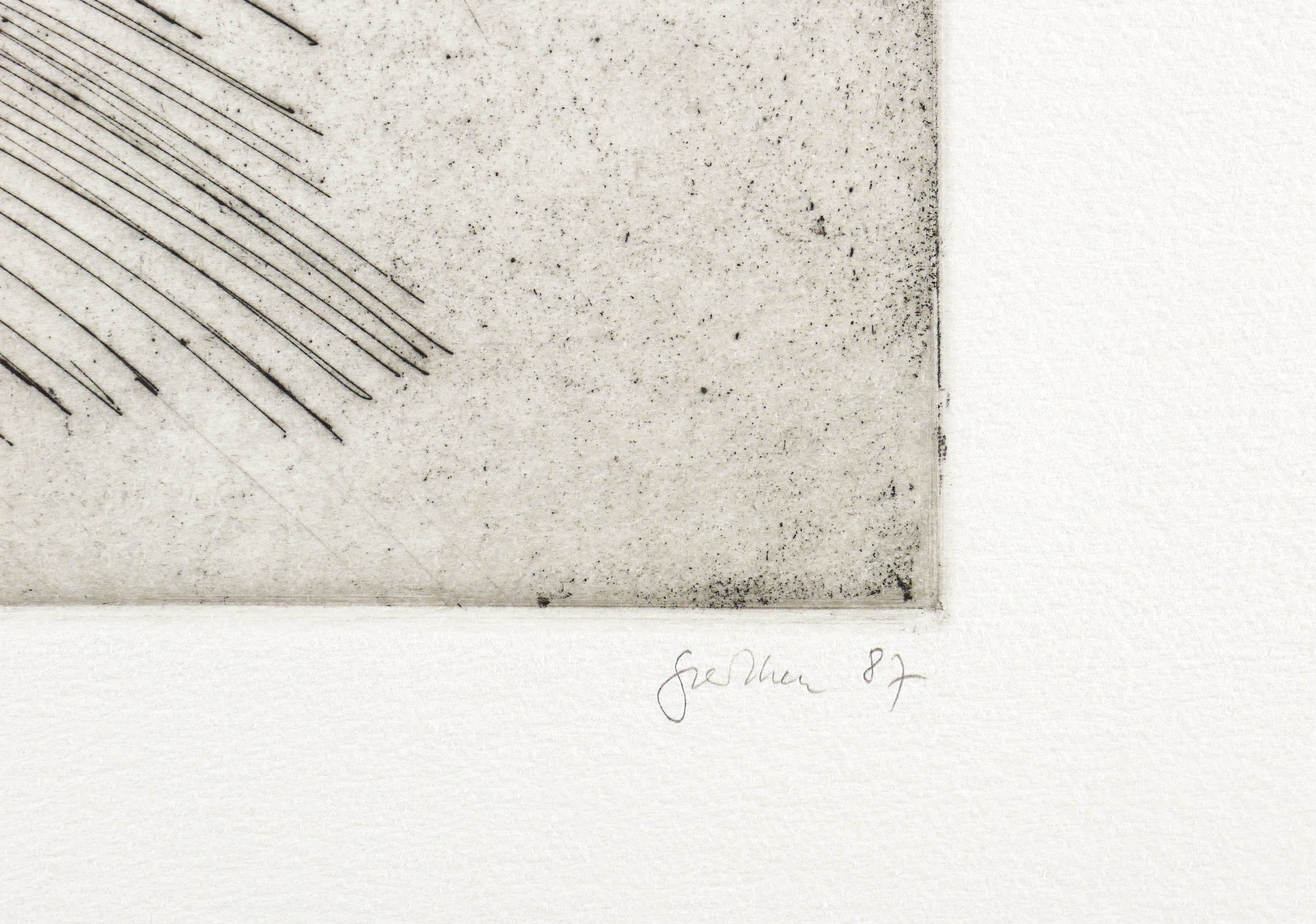 1987. Radierung / Aquatinta, Strichätzung & Kaltnadel, in Schwarz, auf hellchamois Hahnemühle-Bütten. – Originale Künstlergrafik, von Christine Perthen. – Druckerexemplar. – 44,0 x 28,6 cm (Darstellung / Platte), 50 x 37 cm (Blatt).