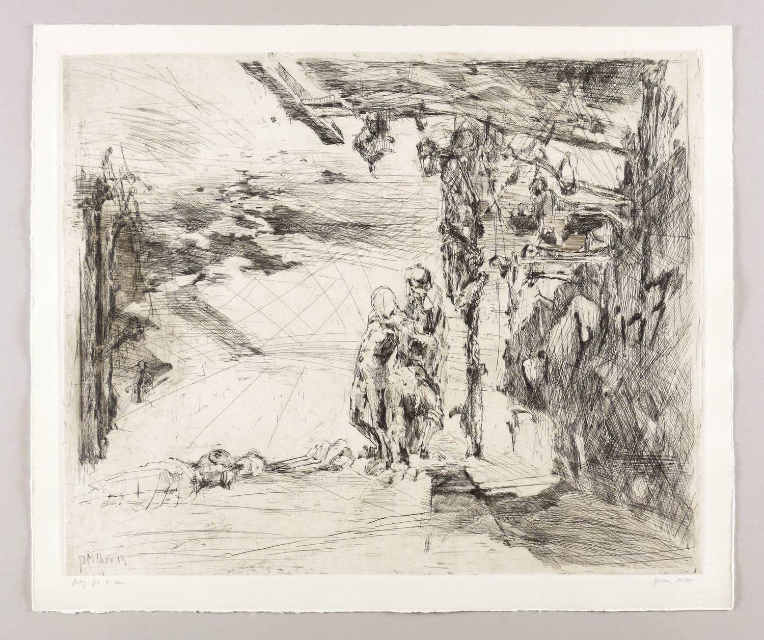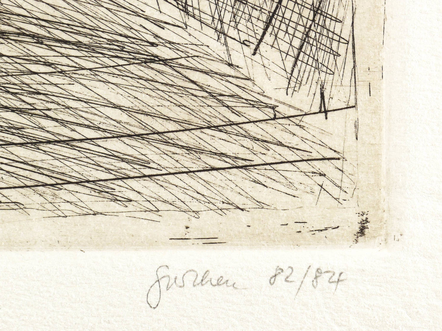 1982/1984. Radierung / Strichätzung & Kaltnadel, in Schwarz, mit Plattenton, auf schwerem hellchamois Velin. – Originale Künstlergrafik, von Christine Perthen. – Druckerexemplar. – 47,7 x 58,0 cm (Darstellung / Platte), 54 x 64 cm (Blatt).